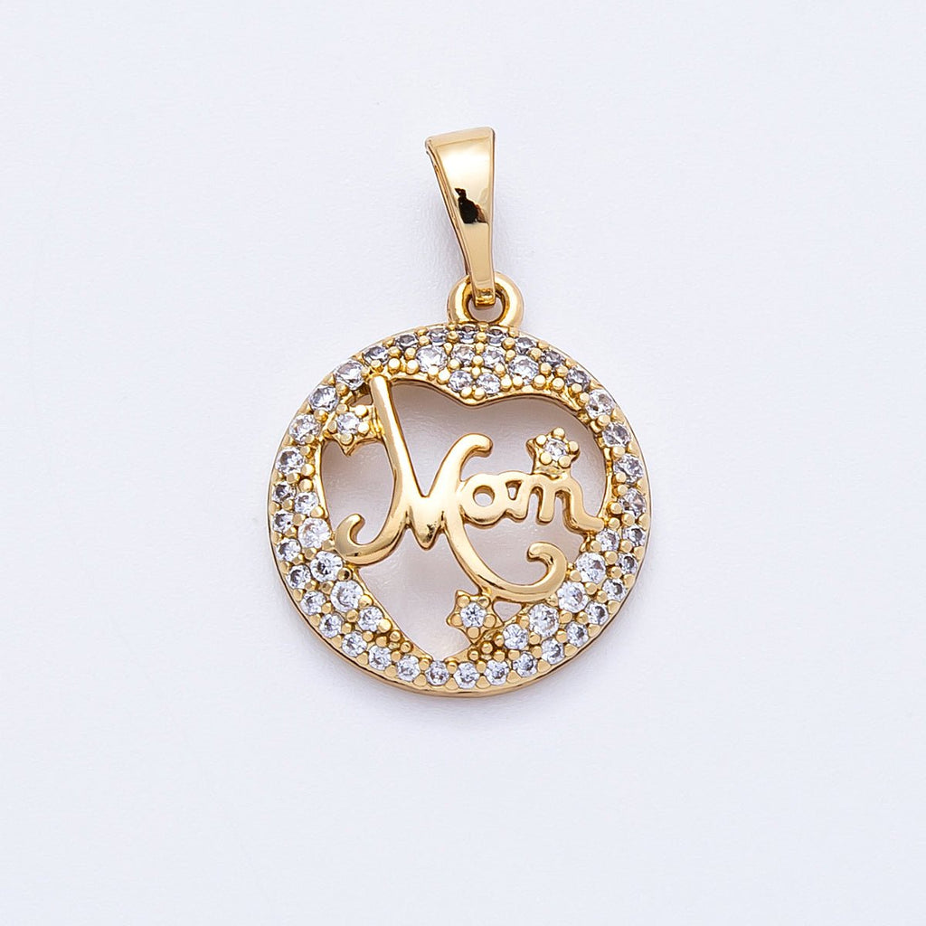14K Gold Filled 17mm Micro Paved CZ "MOM" Open Round Charm | Charms-000329