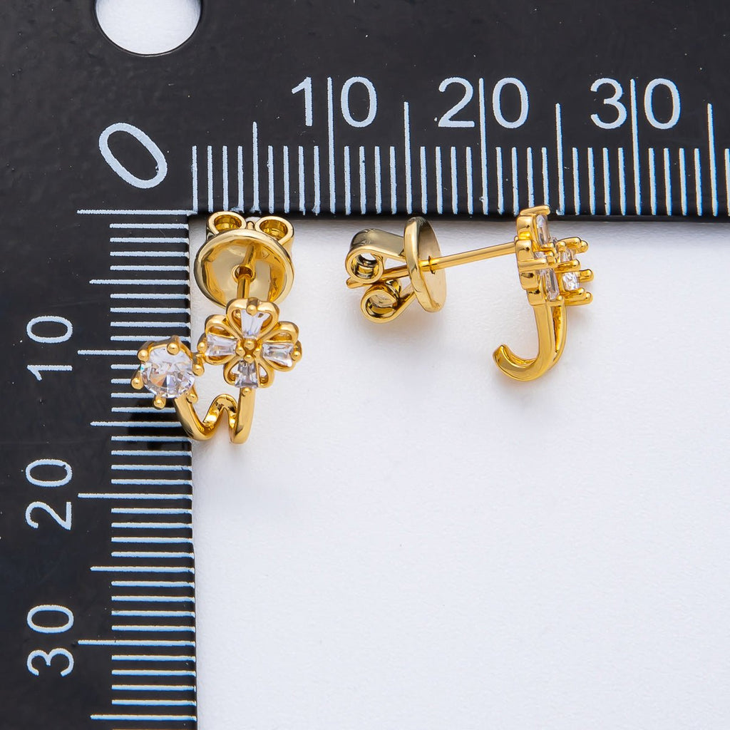 18K Gold Filled 11mm Baguette, Round CZ Tiny Flower Studs Earrings | AD1574