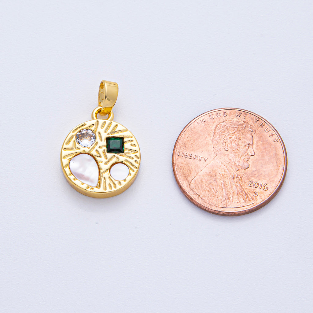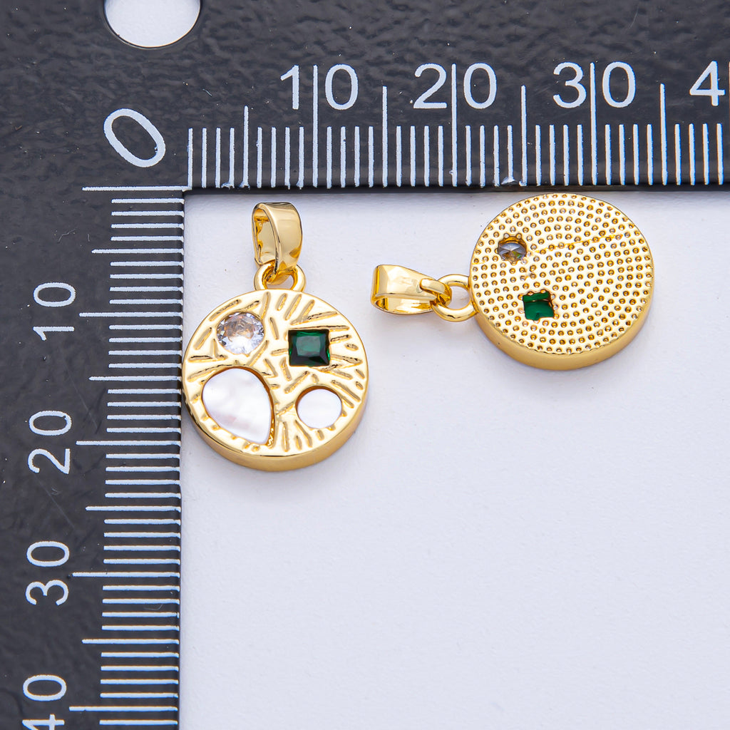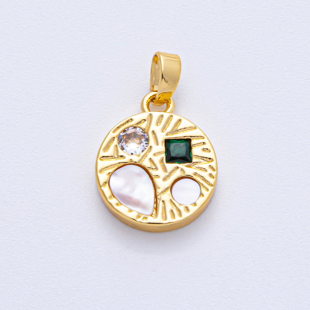 18K Gold Filled 13mm Multicolor CZ Shell Pearl Geometric Textured Round Pendant | AF1207