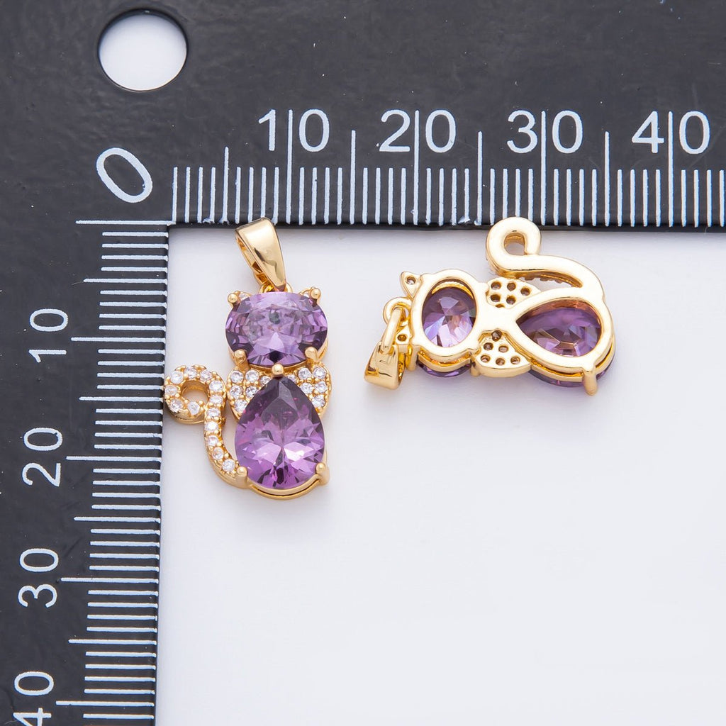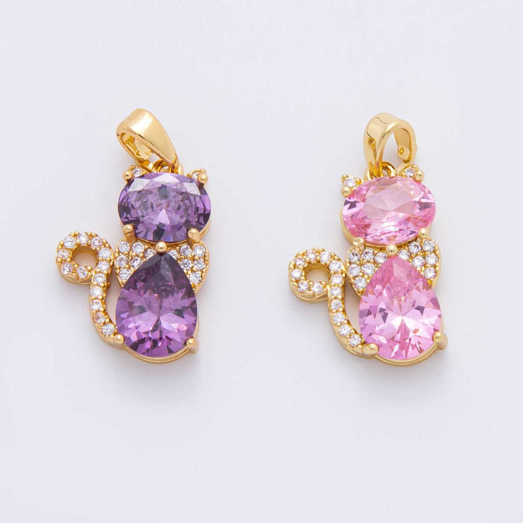 18K Gold Filled 23mm Pink & Purple CZ Cat Figure Animals Pendant | AF-A1122