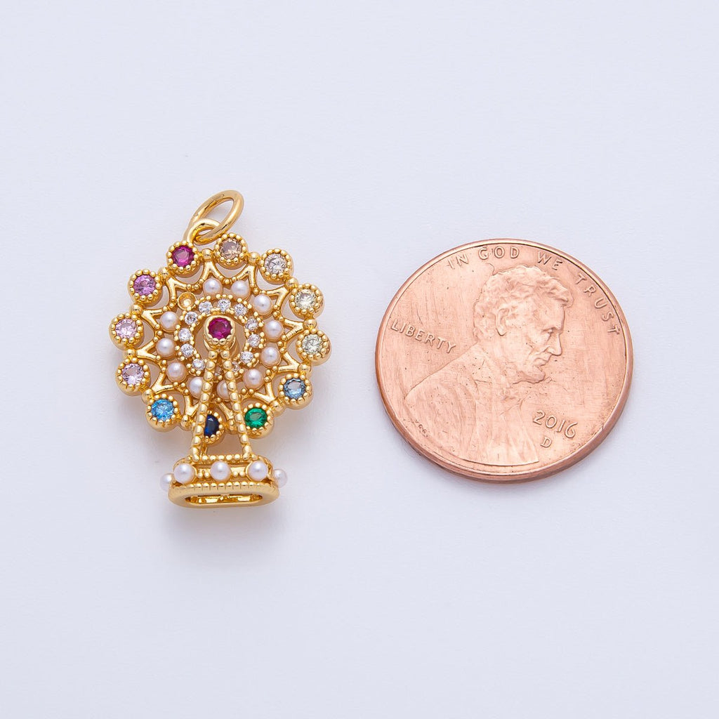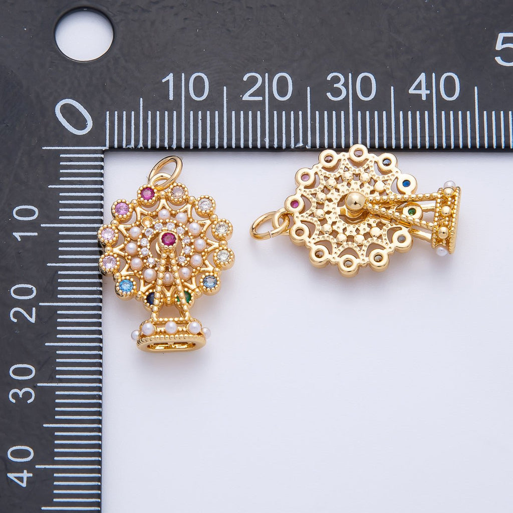 18K Gold Filled 25.5mm Multicolor CZ Shell Pearl Theme Park Ferris Wheel Pendant | AF1397