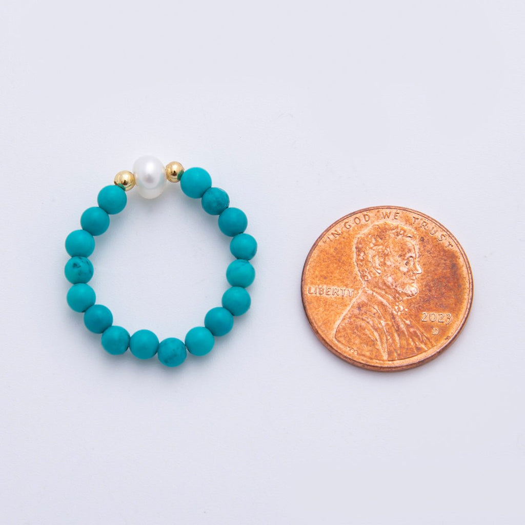 18K Gold Filled Blue Turquoise Gemstone Solitaire Freshwater Pearl Bead Stretch Ring | O188