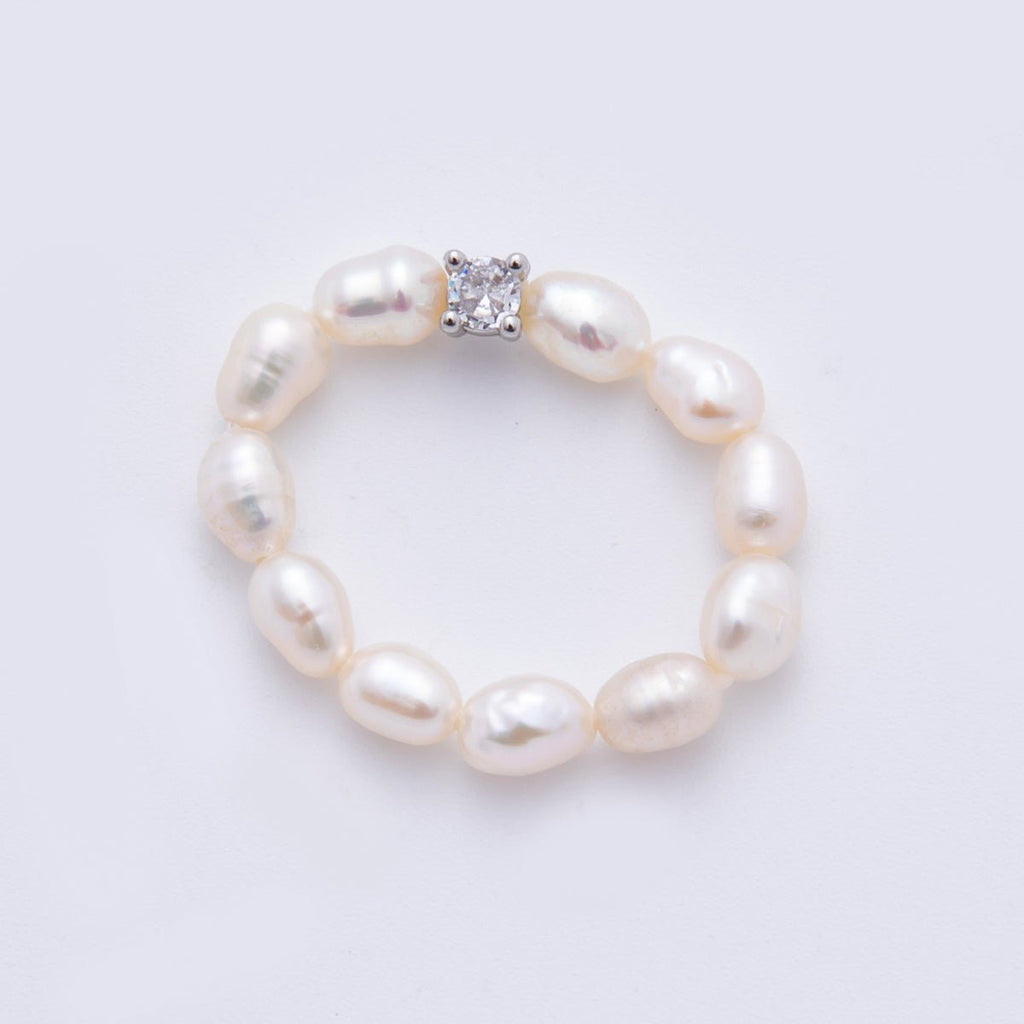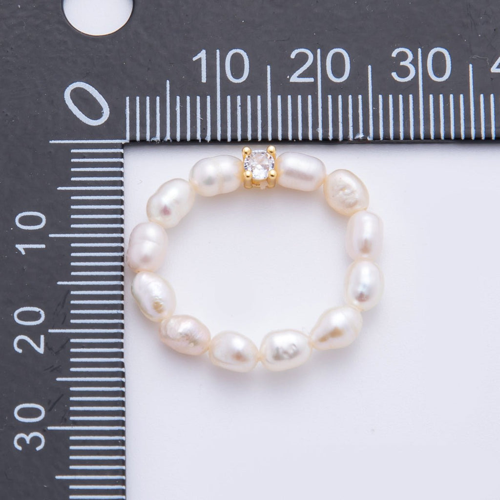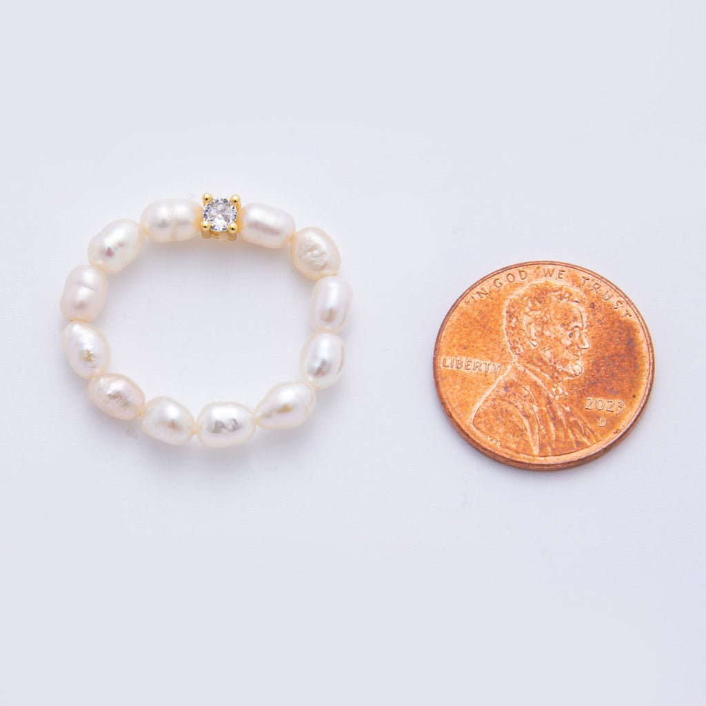 18K Gold Filled Clear CZ Solitaire Freshwater Pearl Handmade Stretch Ring in Gold & Silver | 167 O-168
