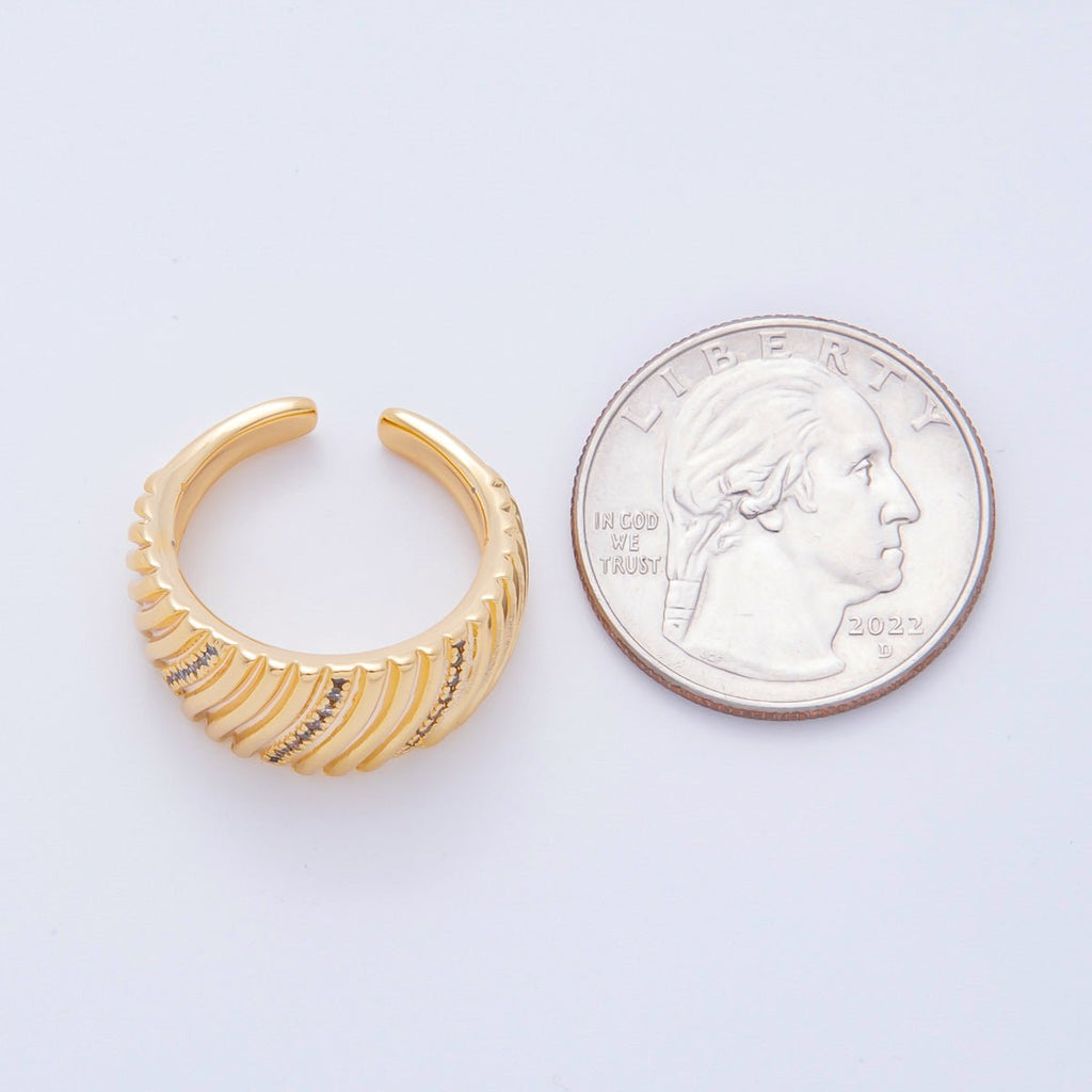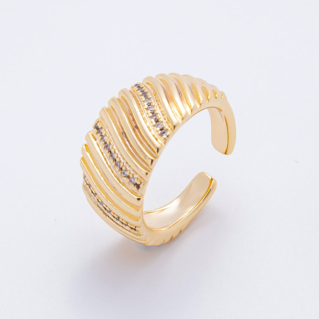 18K Gold Filled Micro Paved CZ Ribbed Line-Textured Wide Dome Ring | O485
