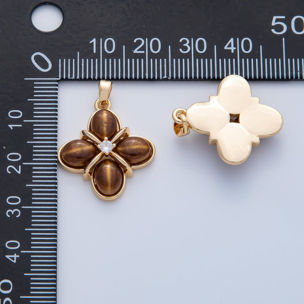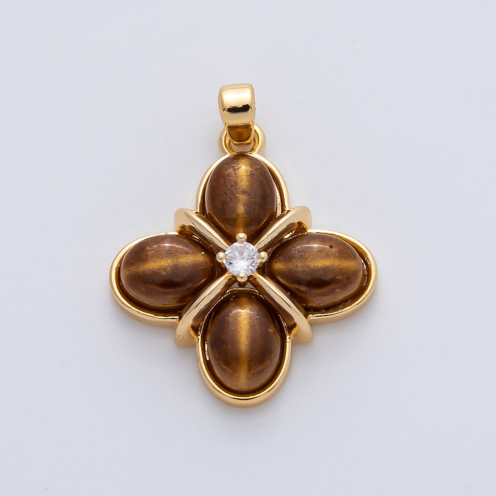 18K Gold Filled Clear CZ Tiger Eye Natural Gemstone Tied Clover Pendant | AF1167