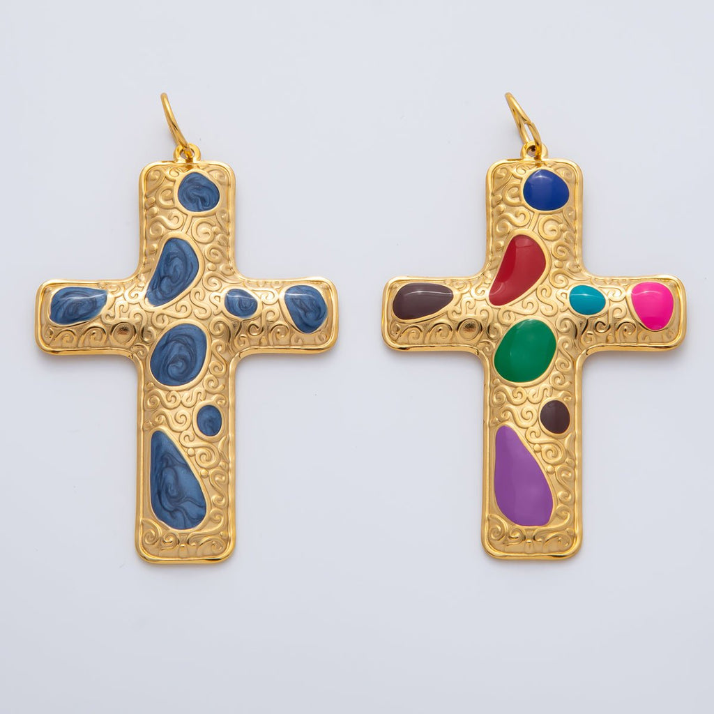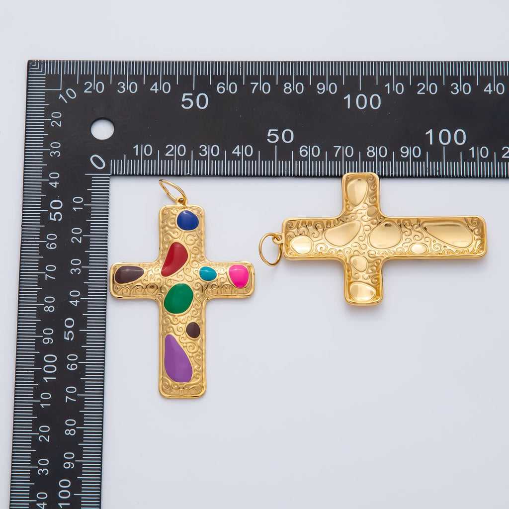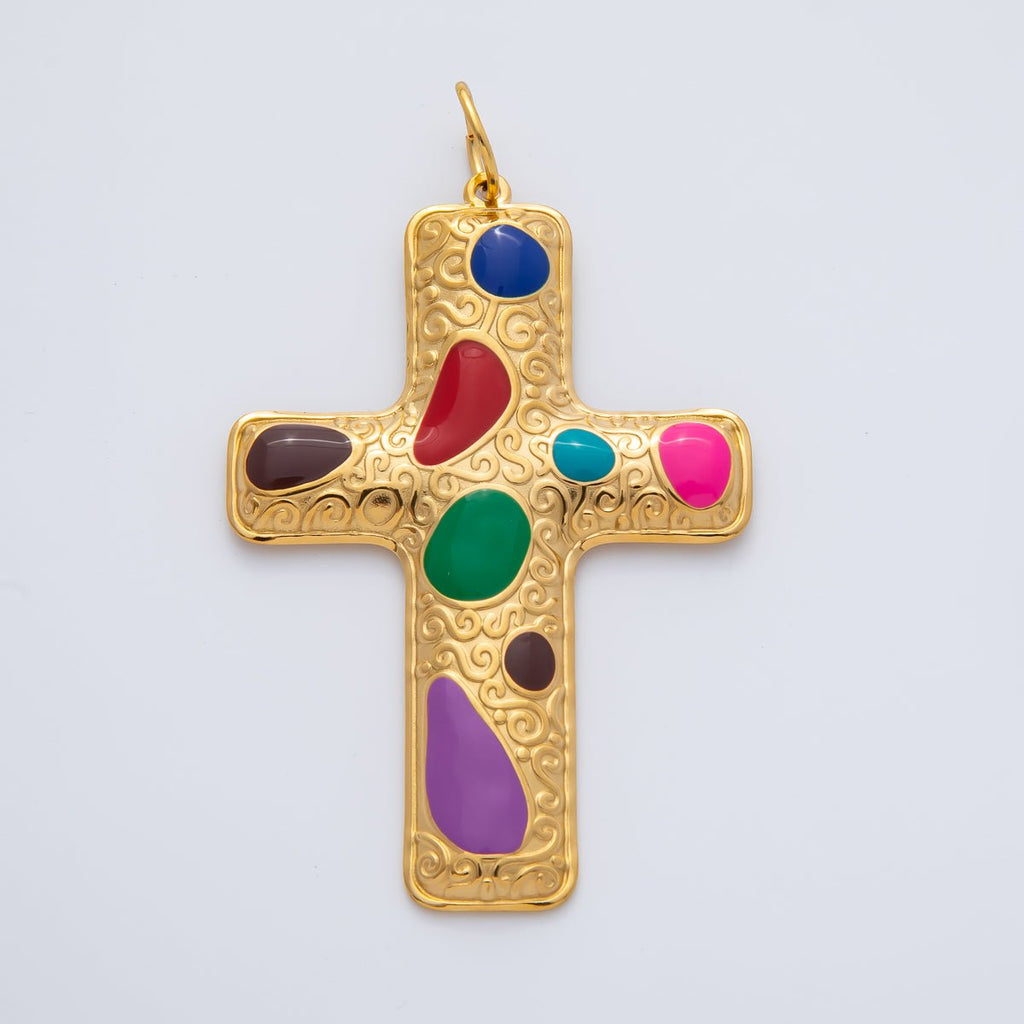 18K Gold Plated 63mm Blue, Multicolor Enamel Patterned Christian Cross Charm | AF1423