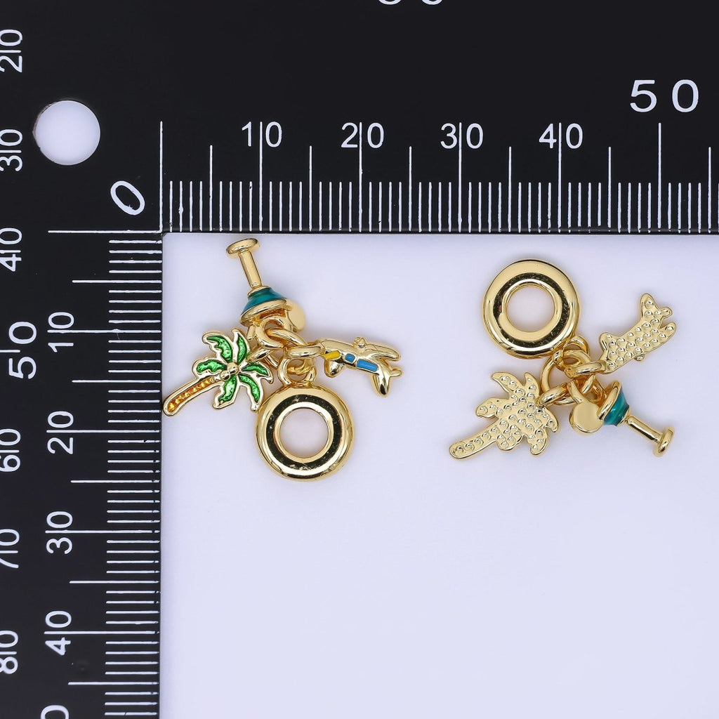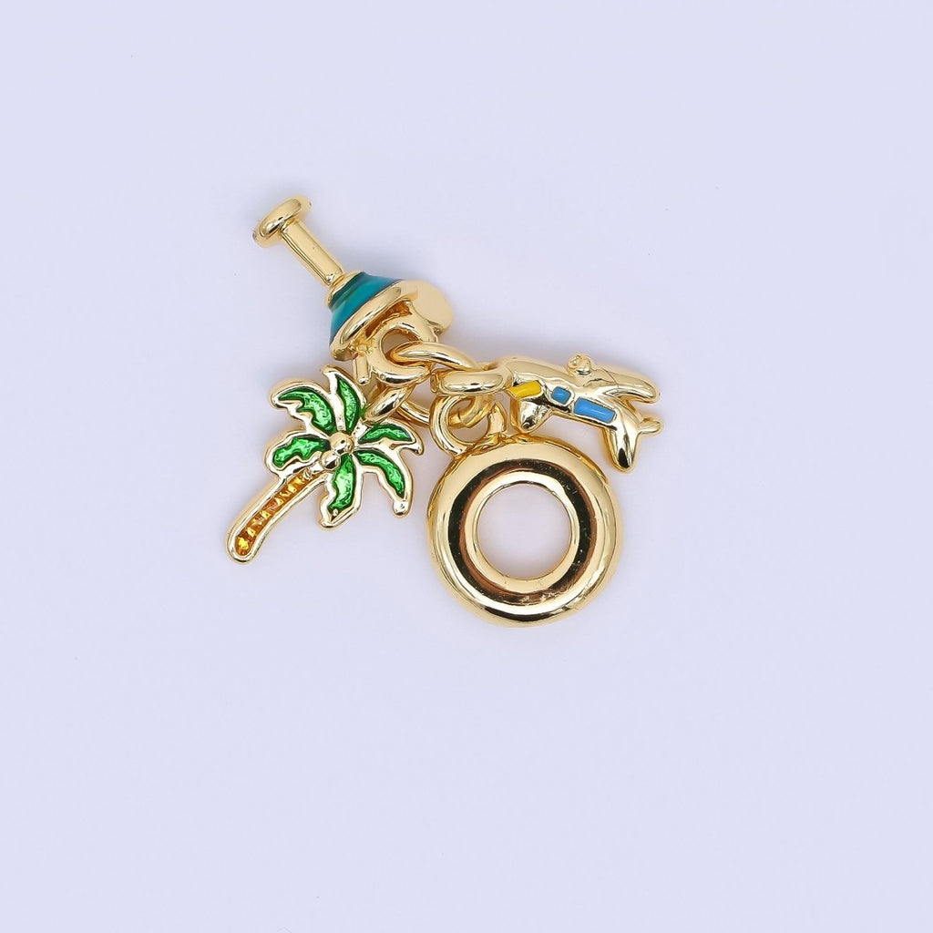 24K Gold Filled 13mm Palm Tree, Cocktails, & Airplane Jet Vacation Travel Set Rondelle Drop Charm | AC1650