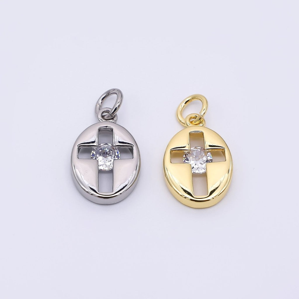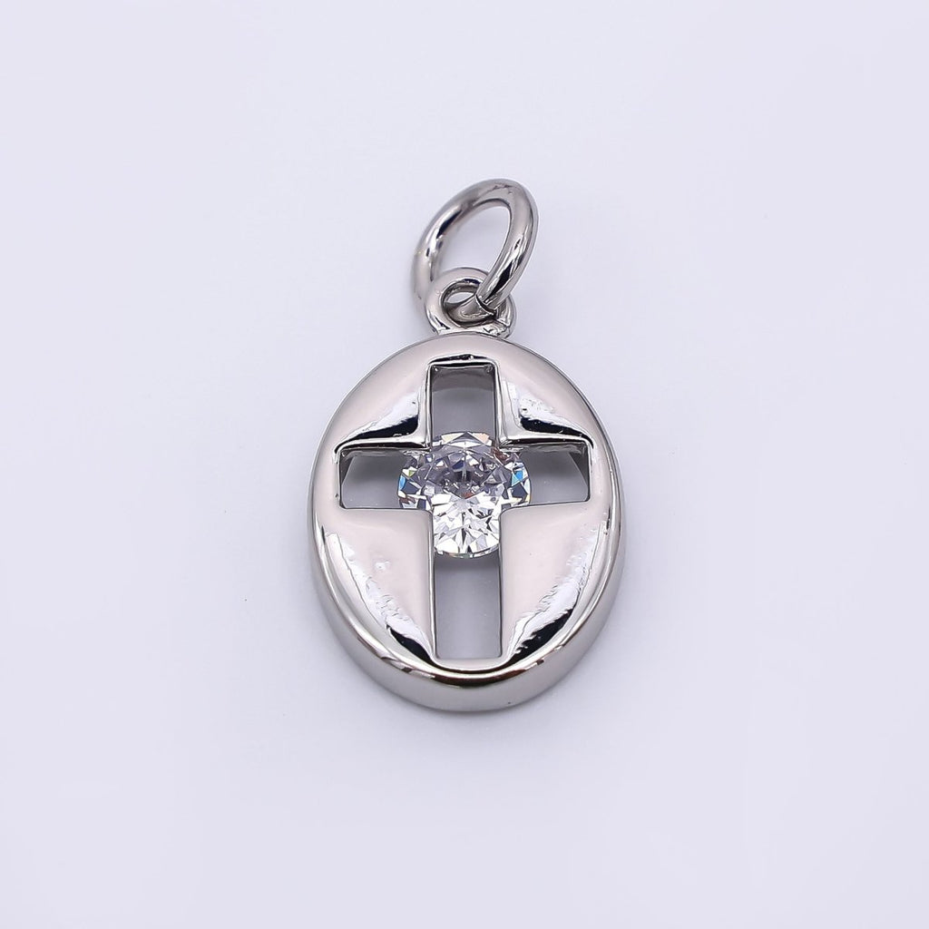 24K Gold Filled 14mm Clear CZ Open Religious Cross Oval Charm in Gold & Silver | AC1598