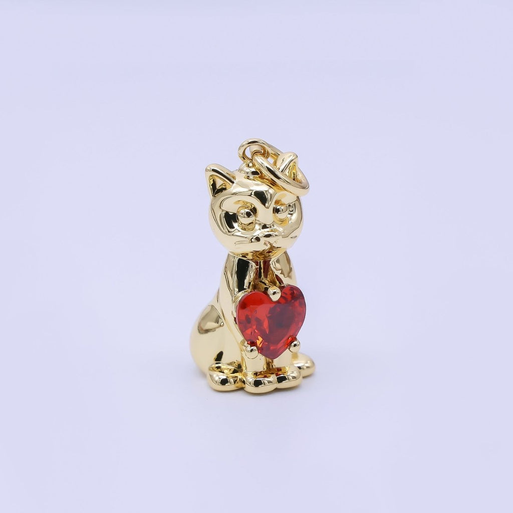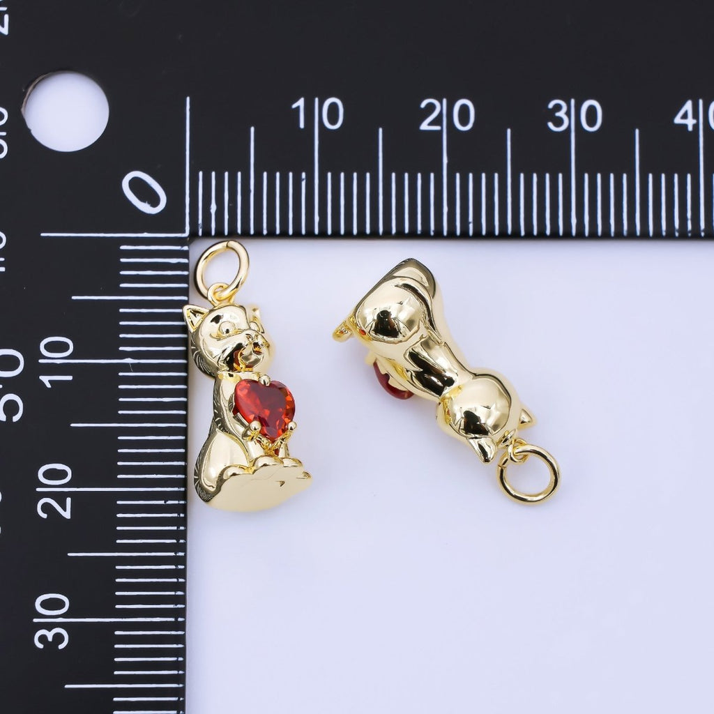 24K Gold Filled 17.5mm Red Heart-Shaped CZ Kitty Cat Pet Charm | AJ398
