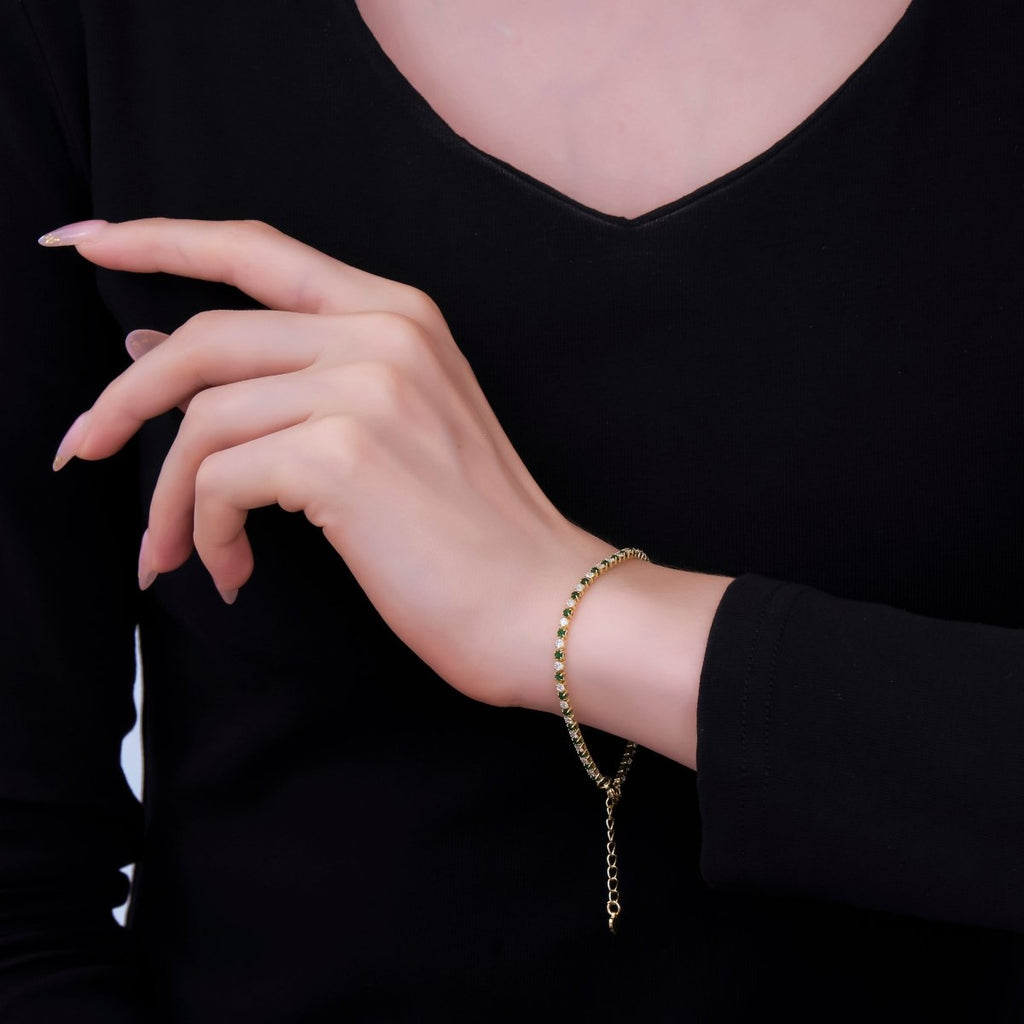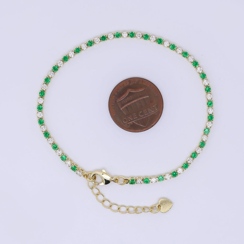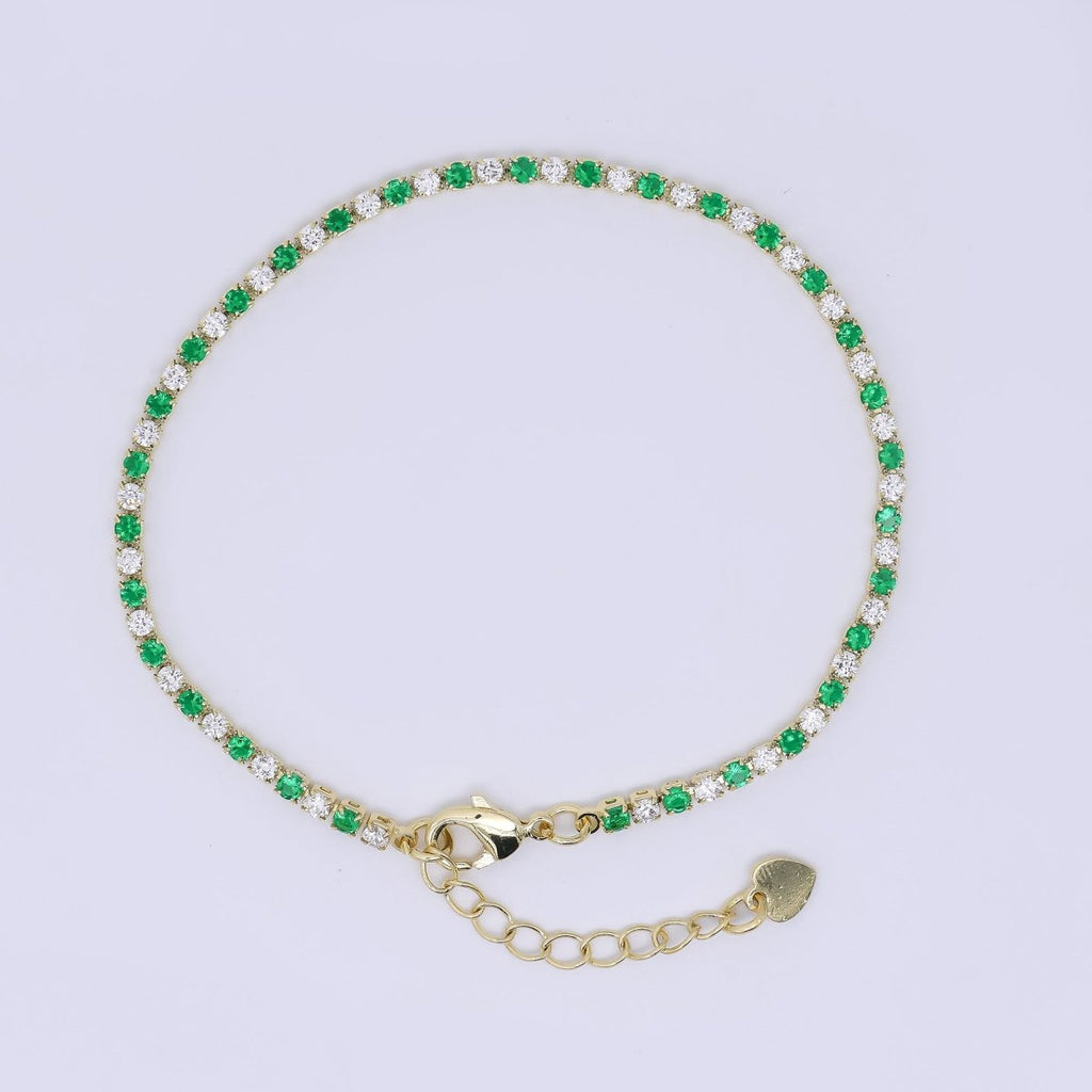 24K Gold Filled 2.2mm Green Clear Alternate CZ Tennis Chain 7 Inch Bracelet w. Extender | WA-2439