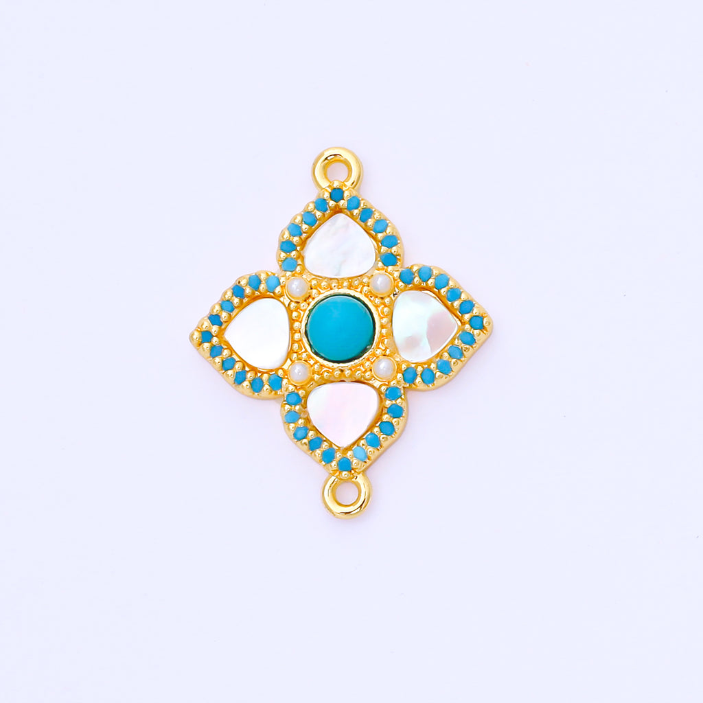 24K Gold Filled 23mm Blue Micro Paved CZ Mother of Pearl 4-Leaf Lucky Clover Charm Connector | Y062