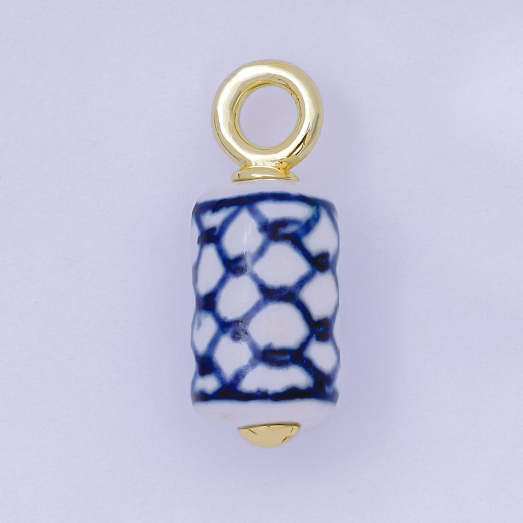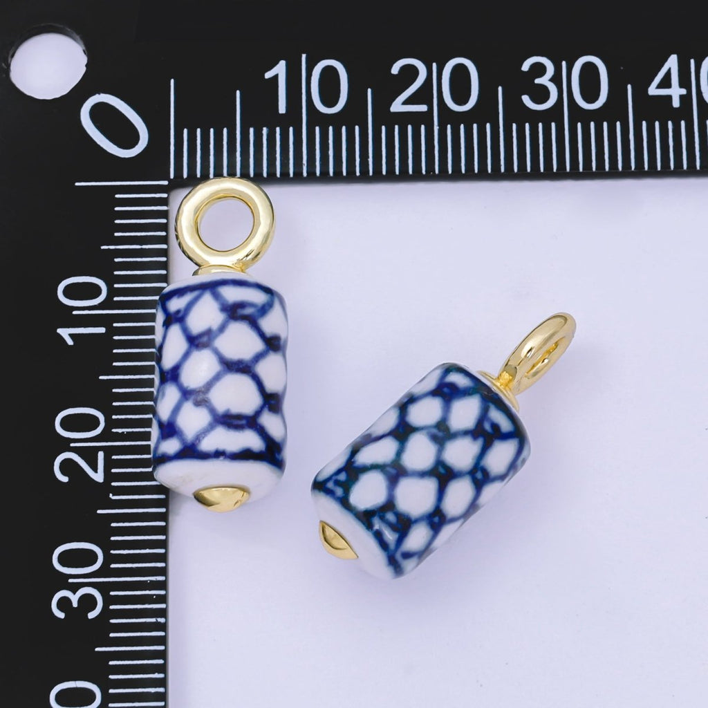 24K Gold Filled 25mm Blue-White Fish Net Porcelain Ceramic Cylinder Drop Charm | AF1281
