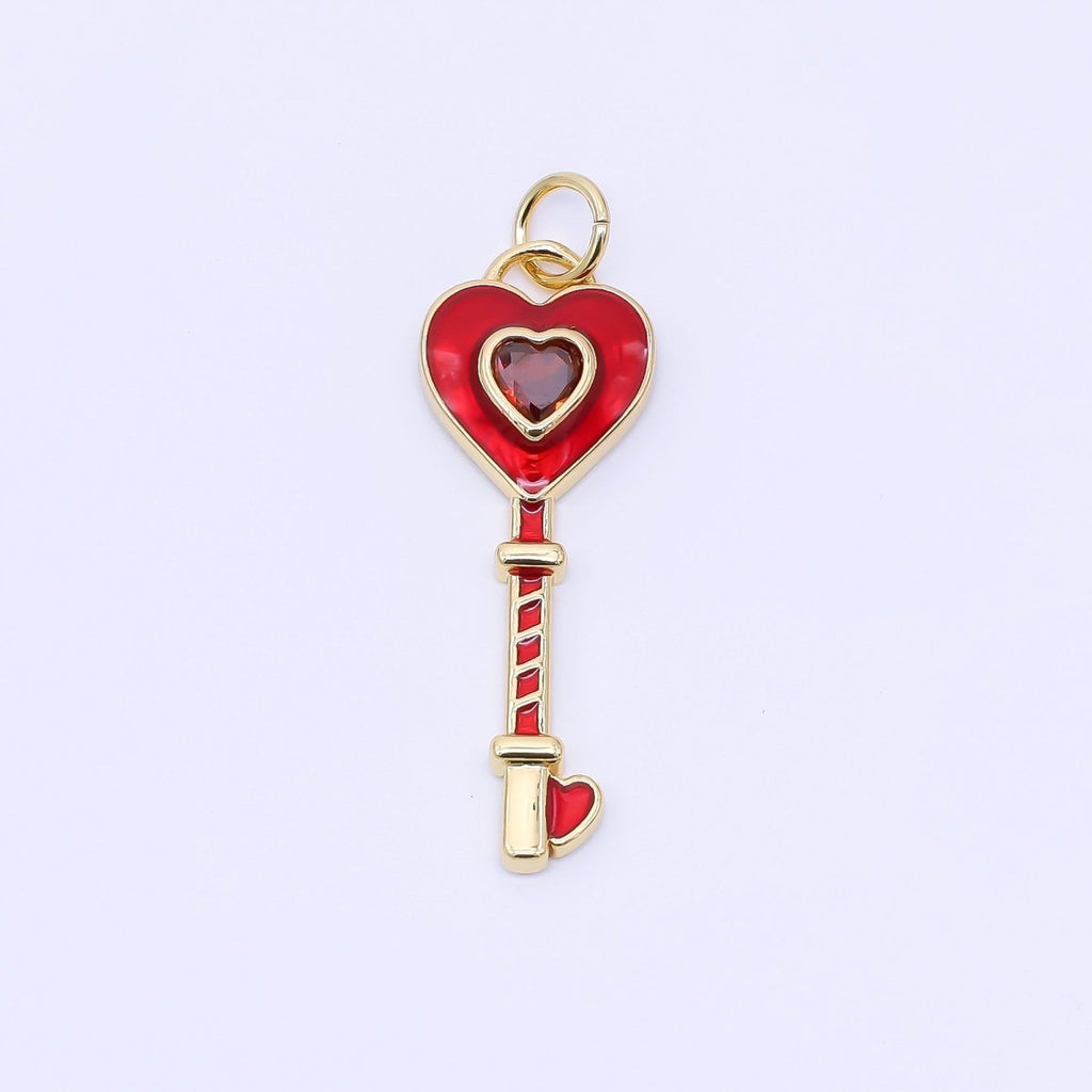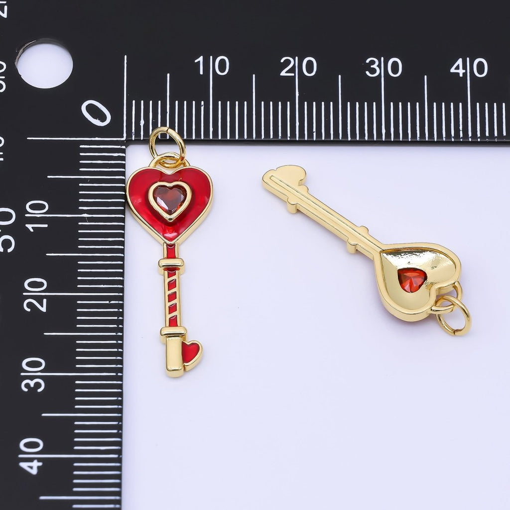 24K Gold Filled 28mm Red Heart-Shaped CZ Hand-Painted Enamel Heart Key Charm | AC1603