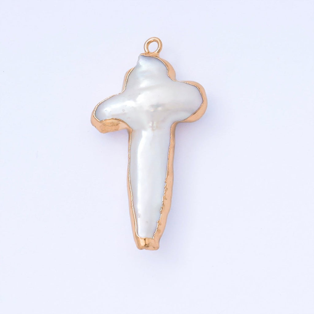 Gold Plated 31mm Baroque White Freshwater Pearl Religious Christian Cross Drop Charm | AF572