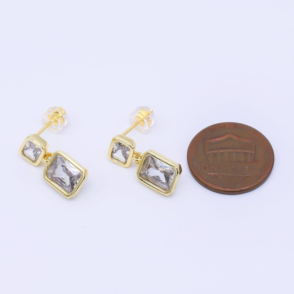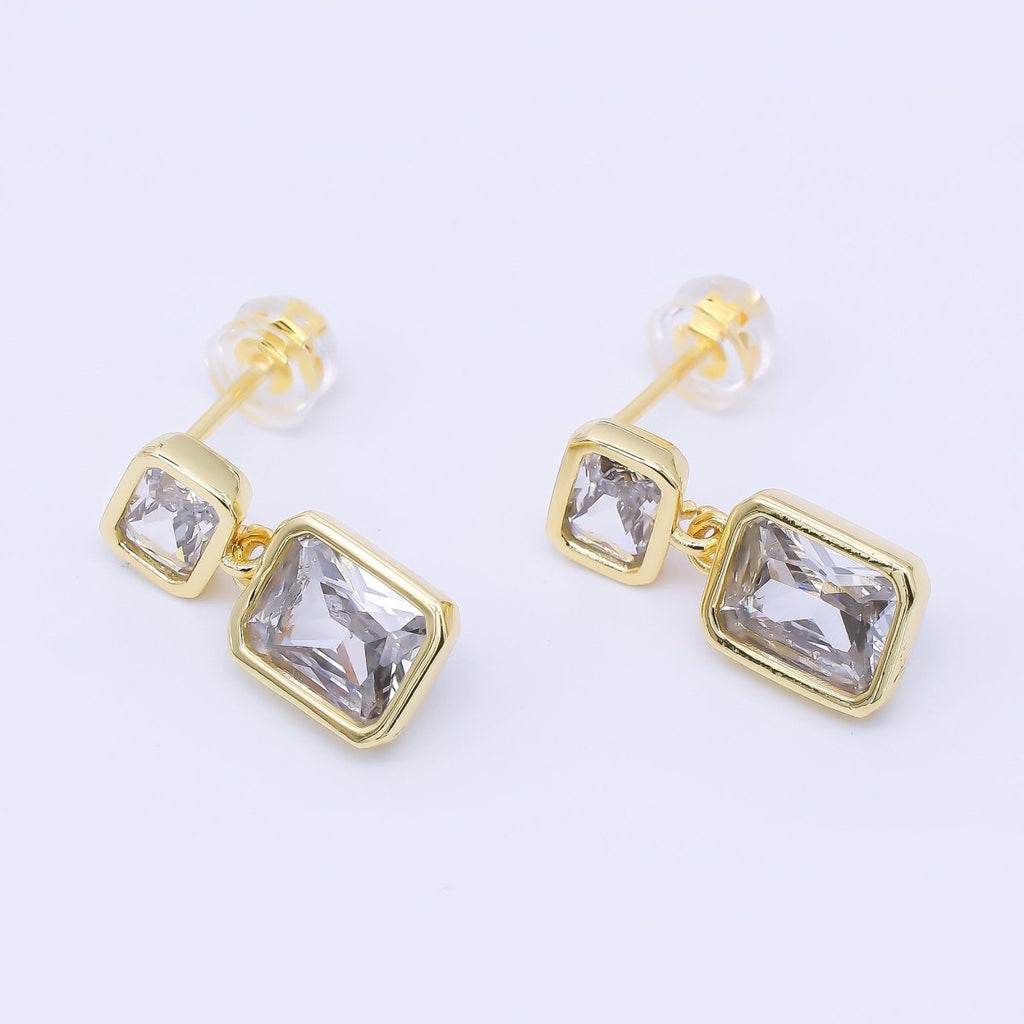 24K Gold Filled Clear CZ Double Square Baguette Drop Stud Earrings | AB1589