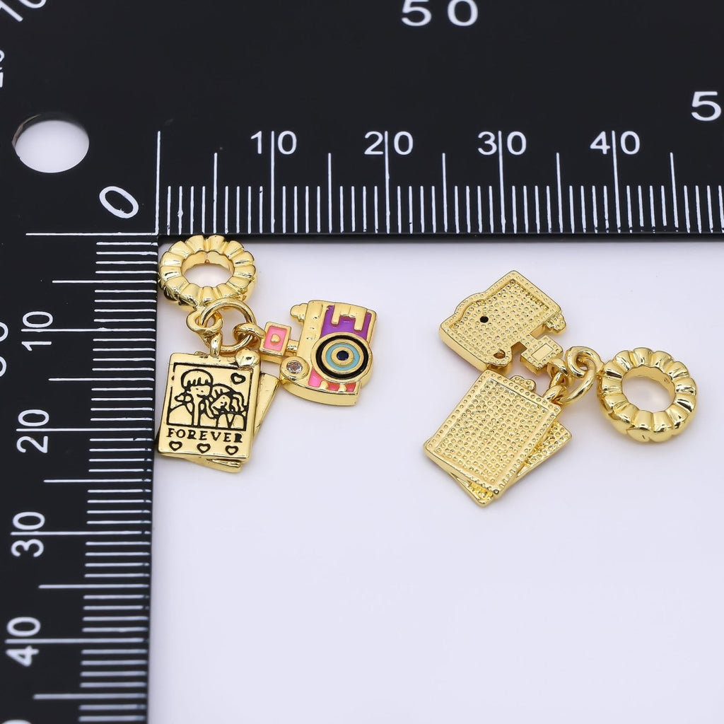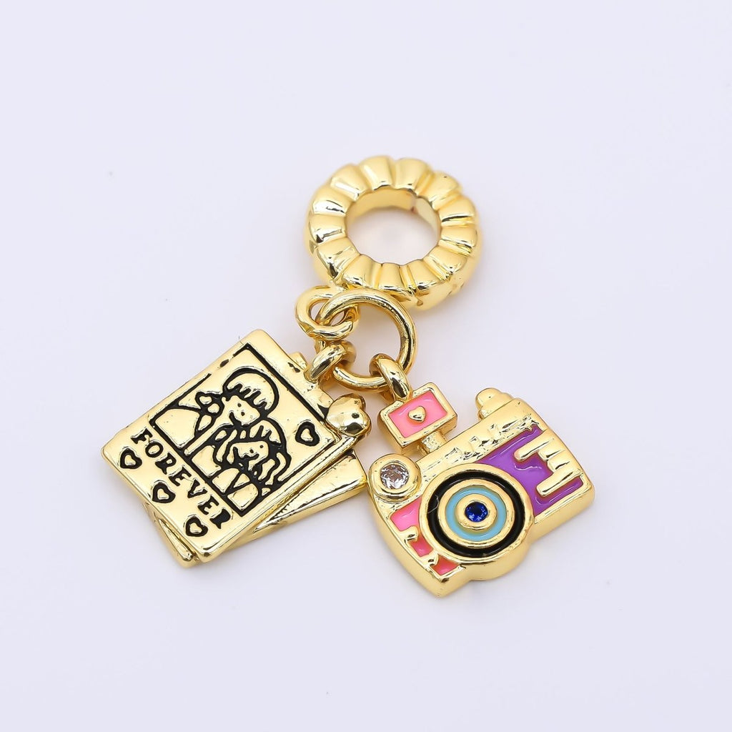 24K Gold Filled Vintage Instant Film Camera Enamel Heart Rondelle Drop Charm | AC1613