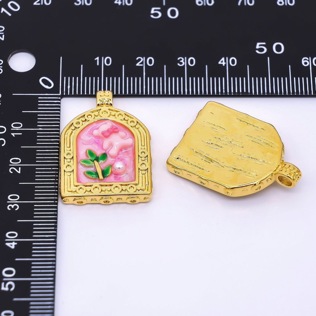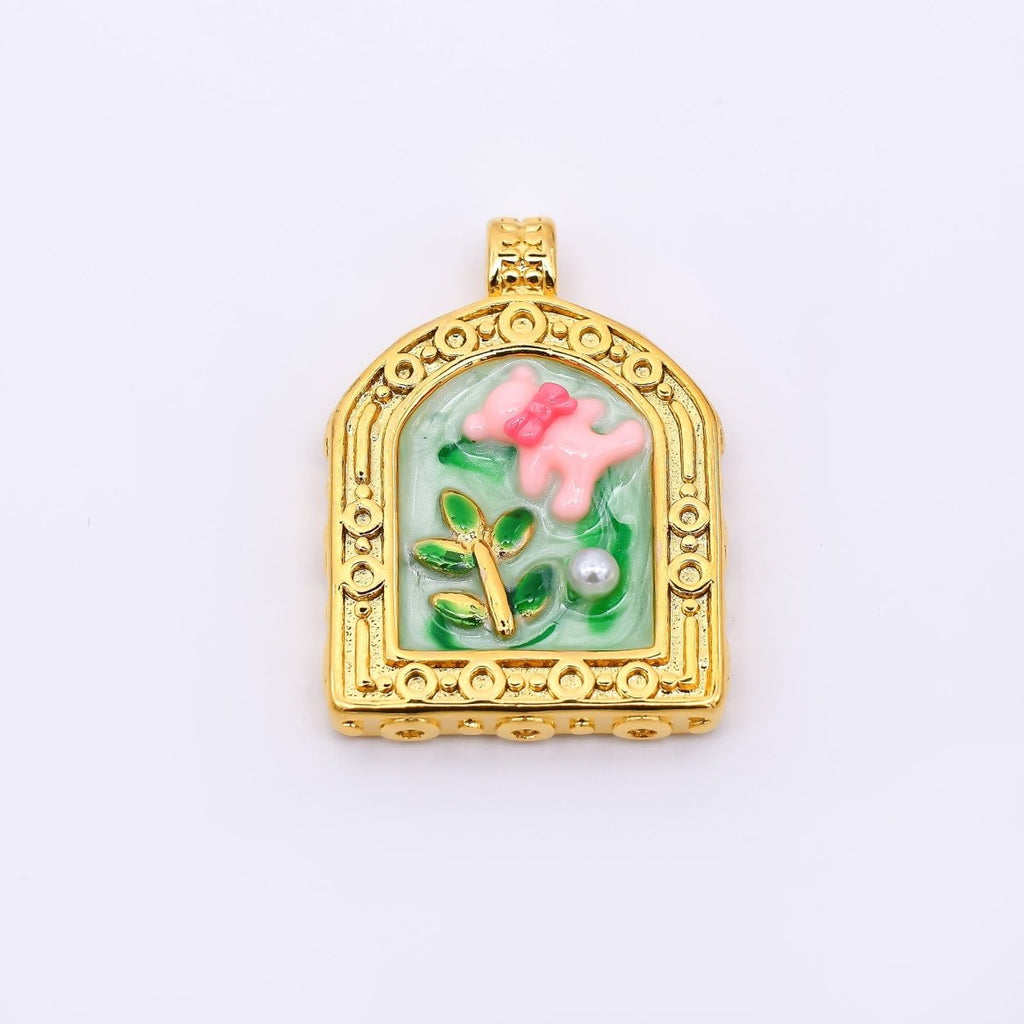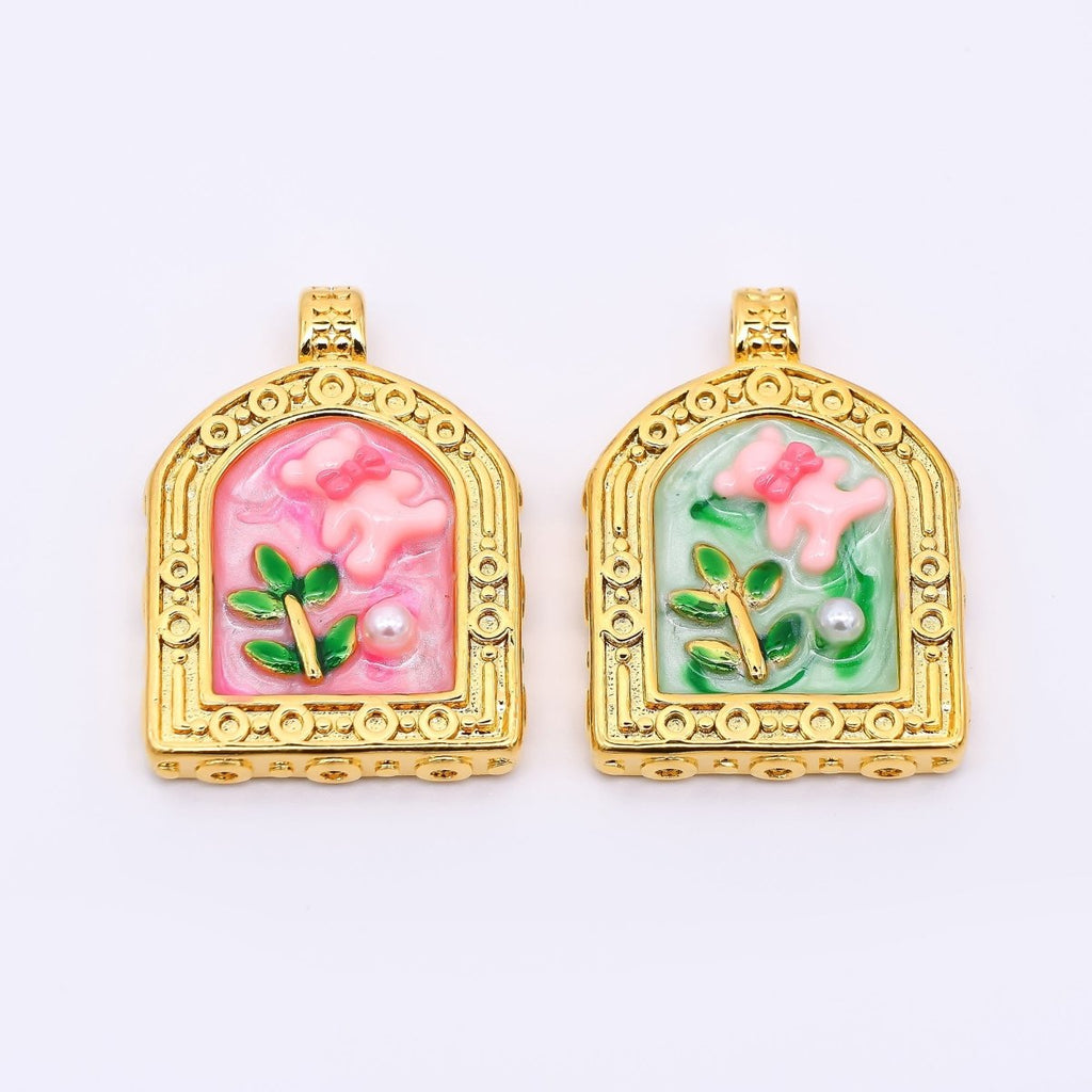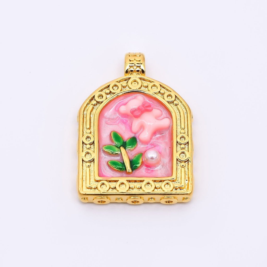 Gold Stainless Steel 30mm Hand-Painted Enamel Teddy Bear and Shell Pearl Pendant in Pink & Green | P663