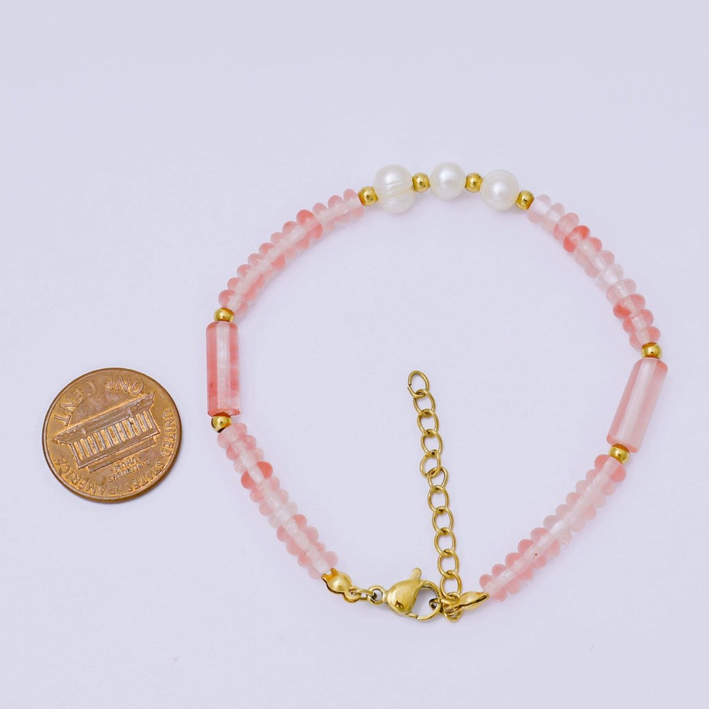 Gold Stainless Steel Watermelon Red Gemstone Tube Beaded Pearl Bracelet | WA-1346