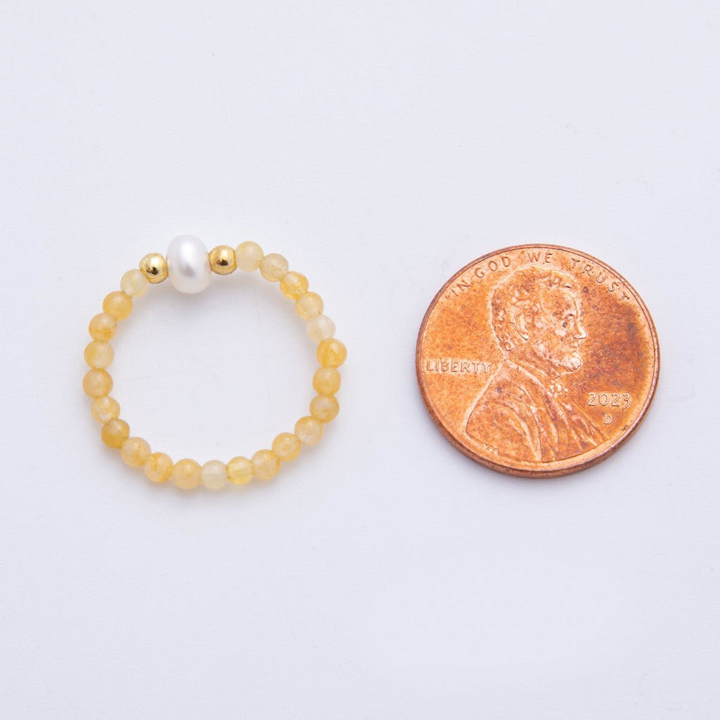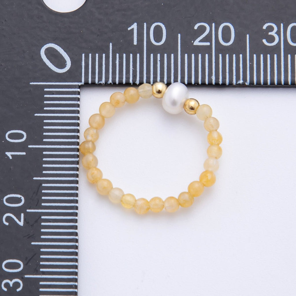 18K Gold Filled Yellow Citrine Gemstone Pearl Bead Stretch Ring | O047