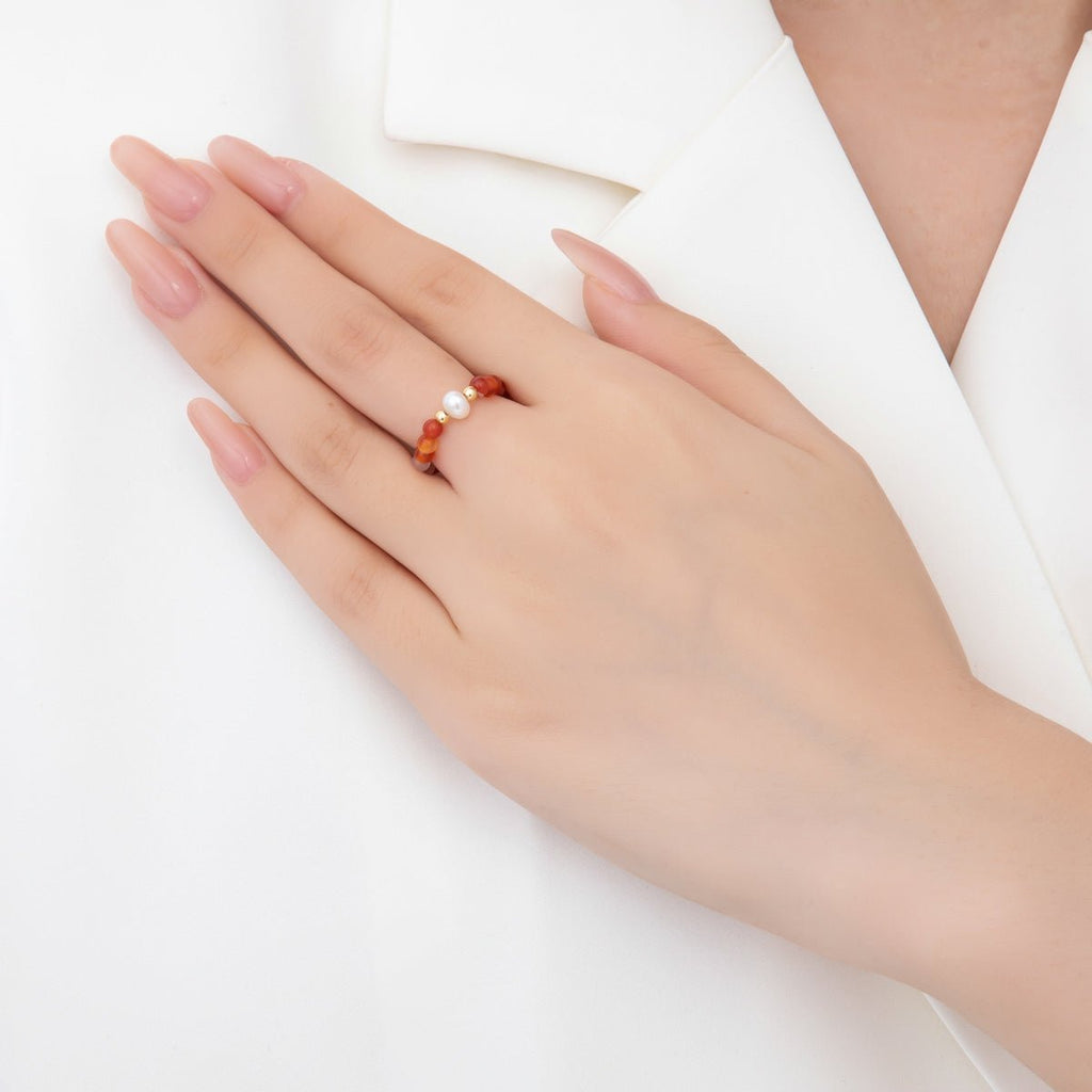 18K Gold Filled Orange Carnelian Gemstone Pearl Ribbed Bead Stretch Ring | O053