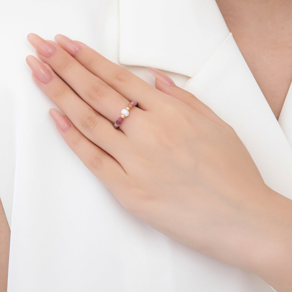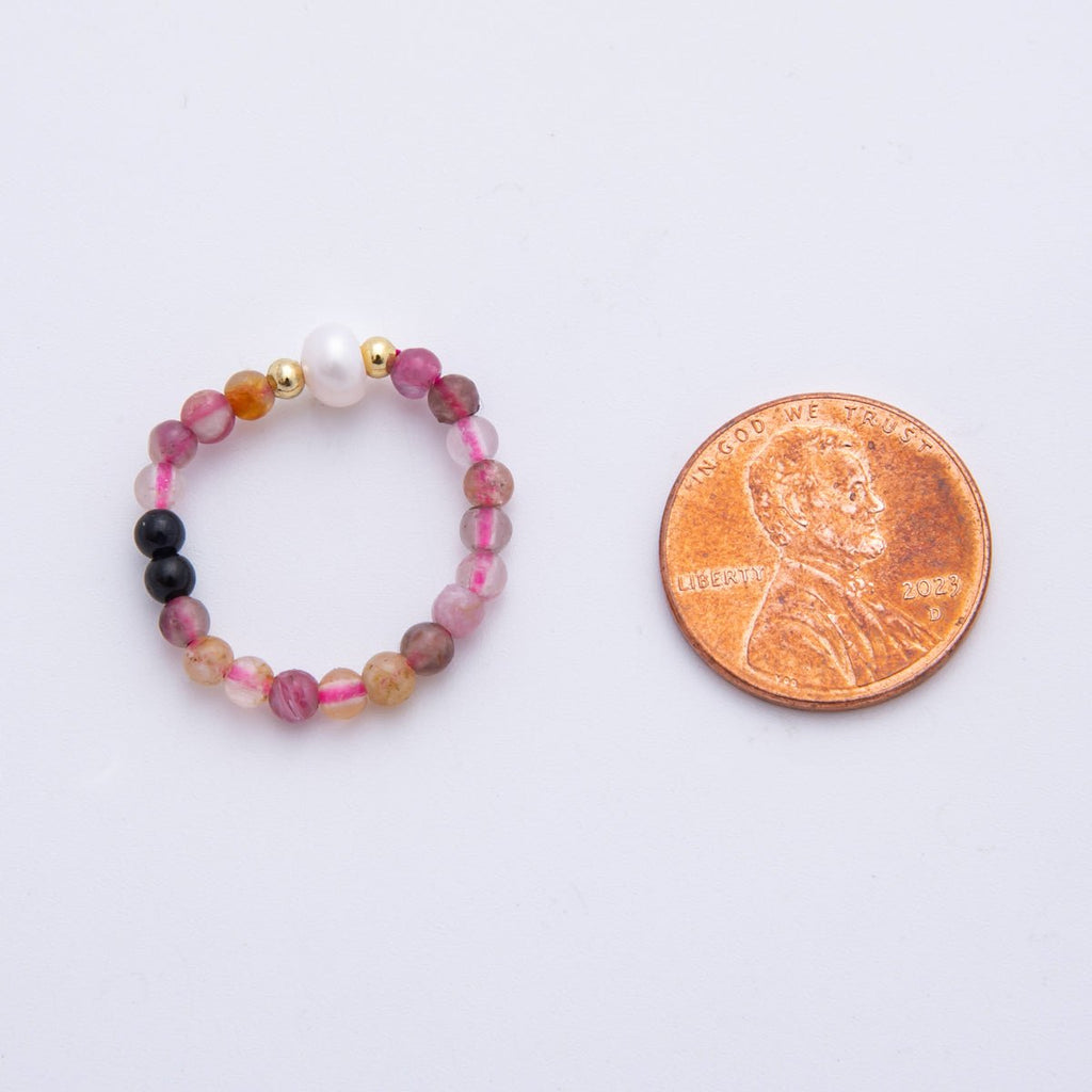 18K Gold Filled Pink Rhodonite Gemstone Pearl Ribbed Bead Stretch Ring | O053