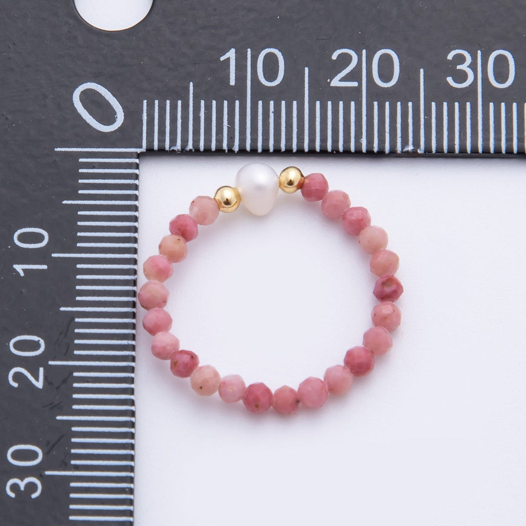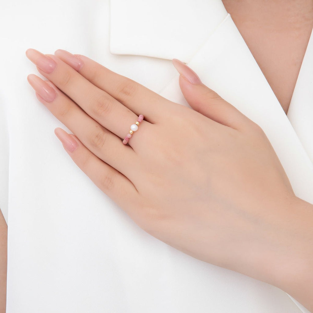18K Gold Filled Pink Opal Gemstone Pearl Bead Stretch Ring | O048