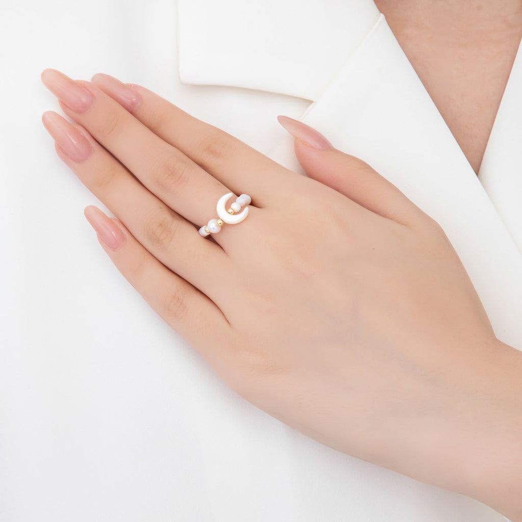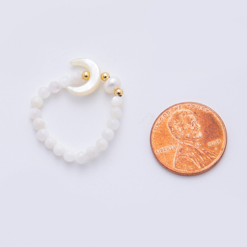 18K Gold Filled White Quartz Crescent Moon Shell Pearl Bead Stretch Ring | O050