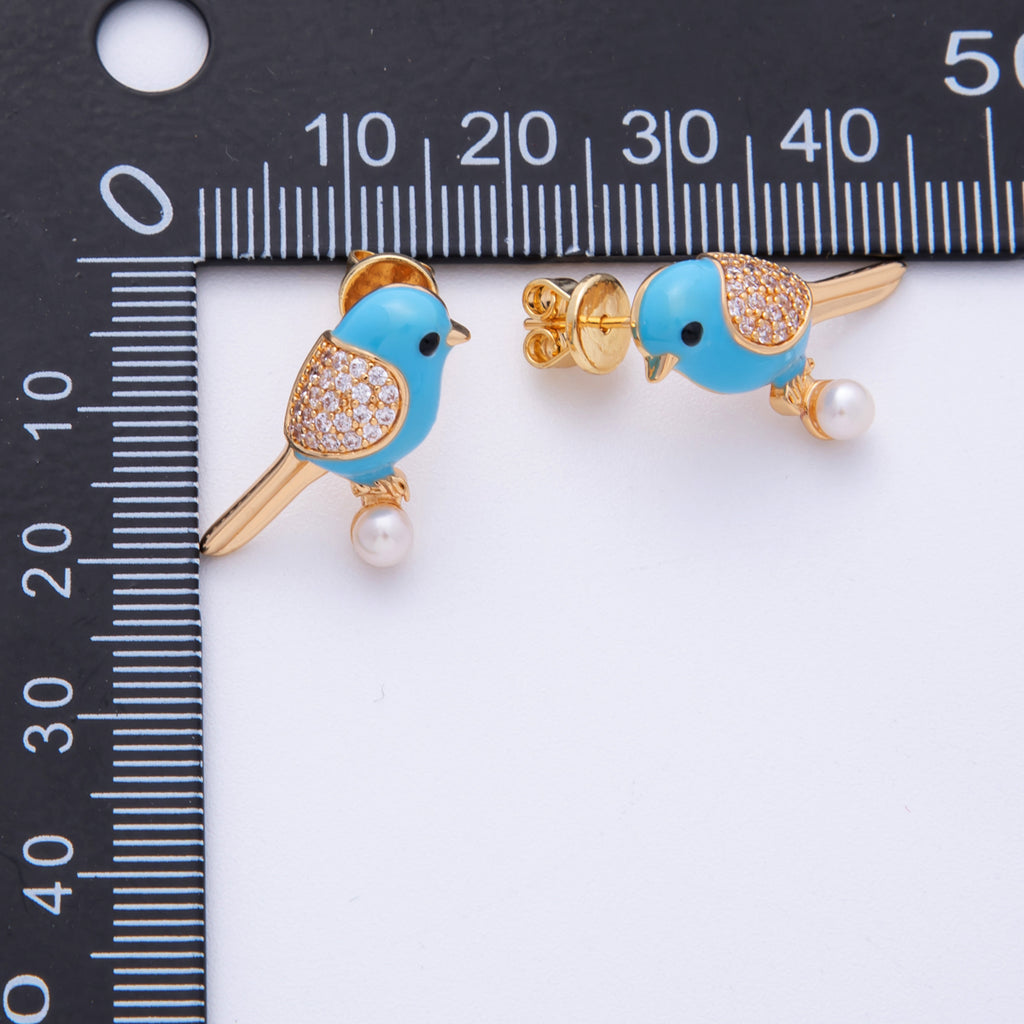 14K Gold Filled 21.5mm Blue Enamel Micro Paved CZ Parrot Bird Stud Earrings | Earrings-020012