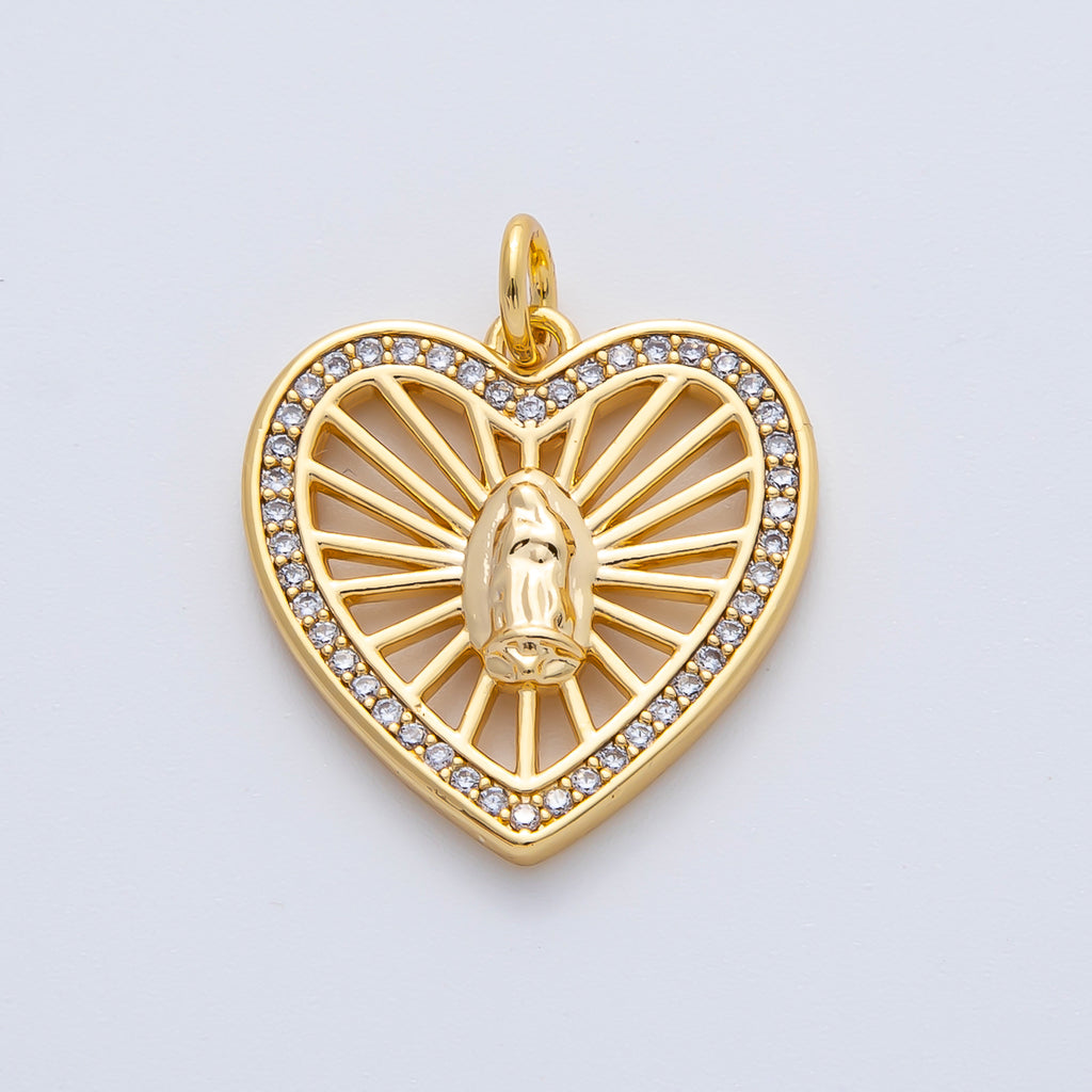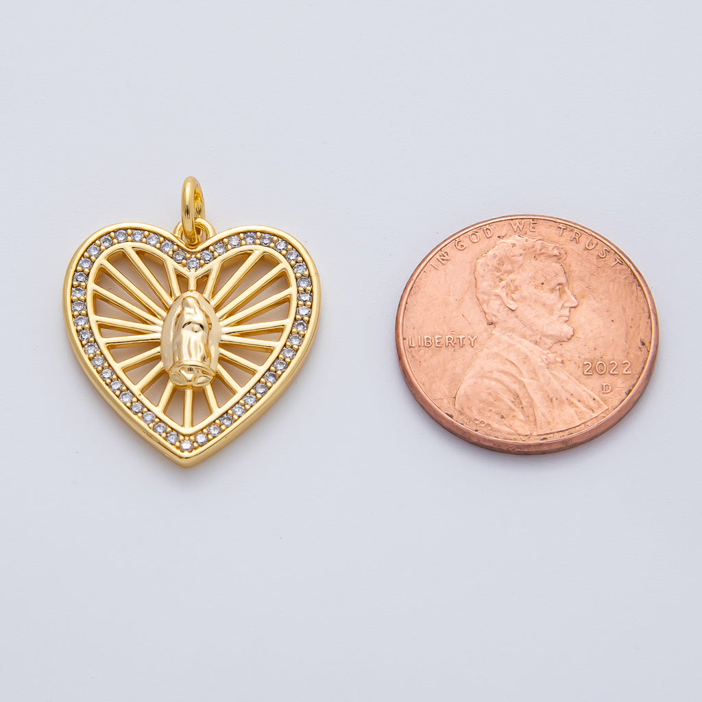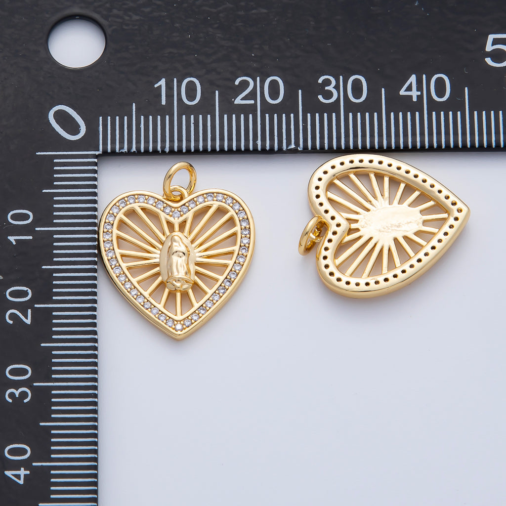 18K Gold Filled 19.5mm Mother Mary Micro Paved CZ Open Bar Heart Charm | AF1466
