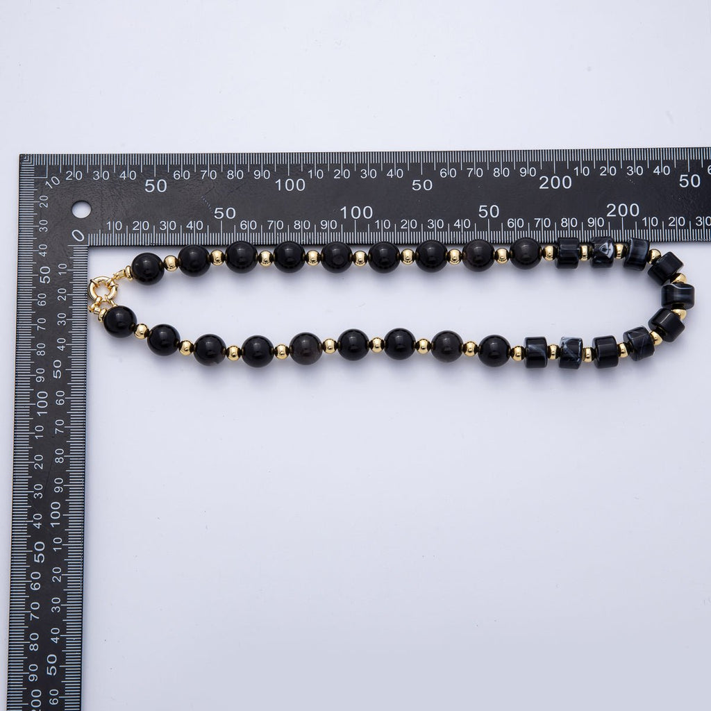 18K Gold Filled 12mm Black Nero Marquina Onyx Tube Round Bead 18.7 Inch w. Sailor Clasps | WA-4133