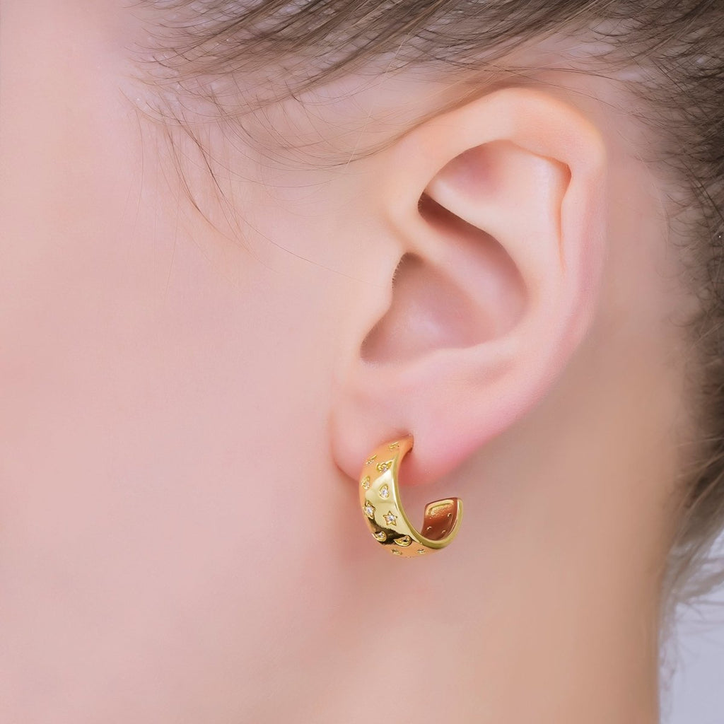 24K Gold Filled 20mm CZ Star Moon Heart C-Shaped Hoop Earrings | AB1563