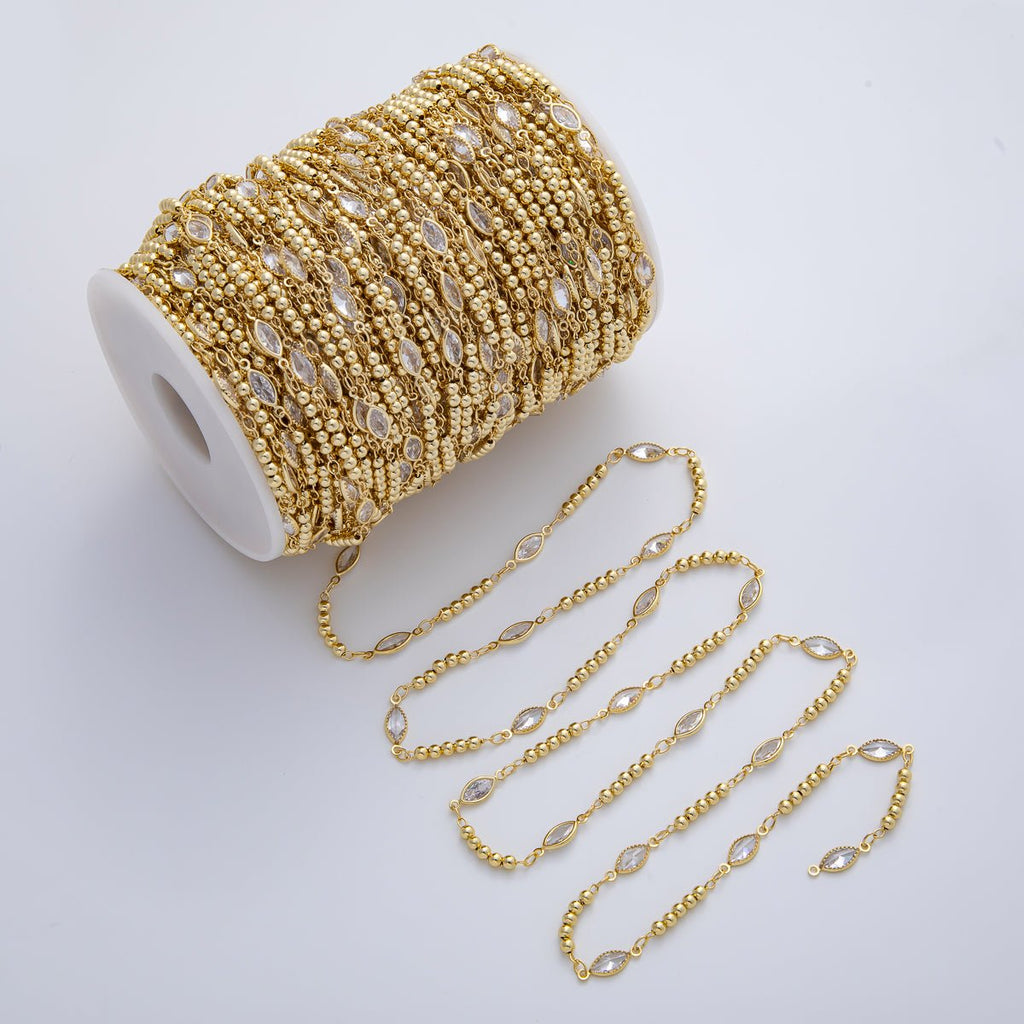 18K Gold Filled 3mm Clear Marquise CZ Bezel Bead Unfinished Chain by Yard | Roll-1775