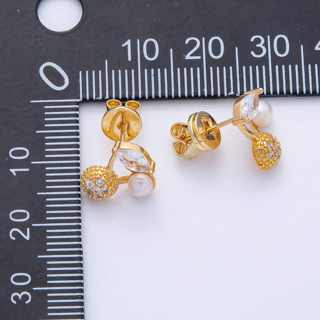 18K Gold Filled 15mm Micro Paved CZ Shell Pearl Cherry Fruit Stud Earrings | A1677