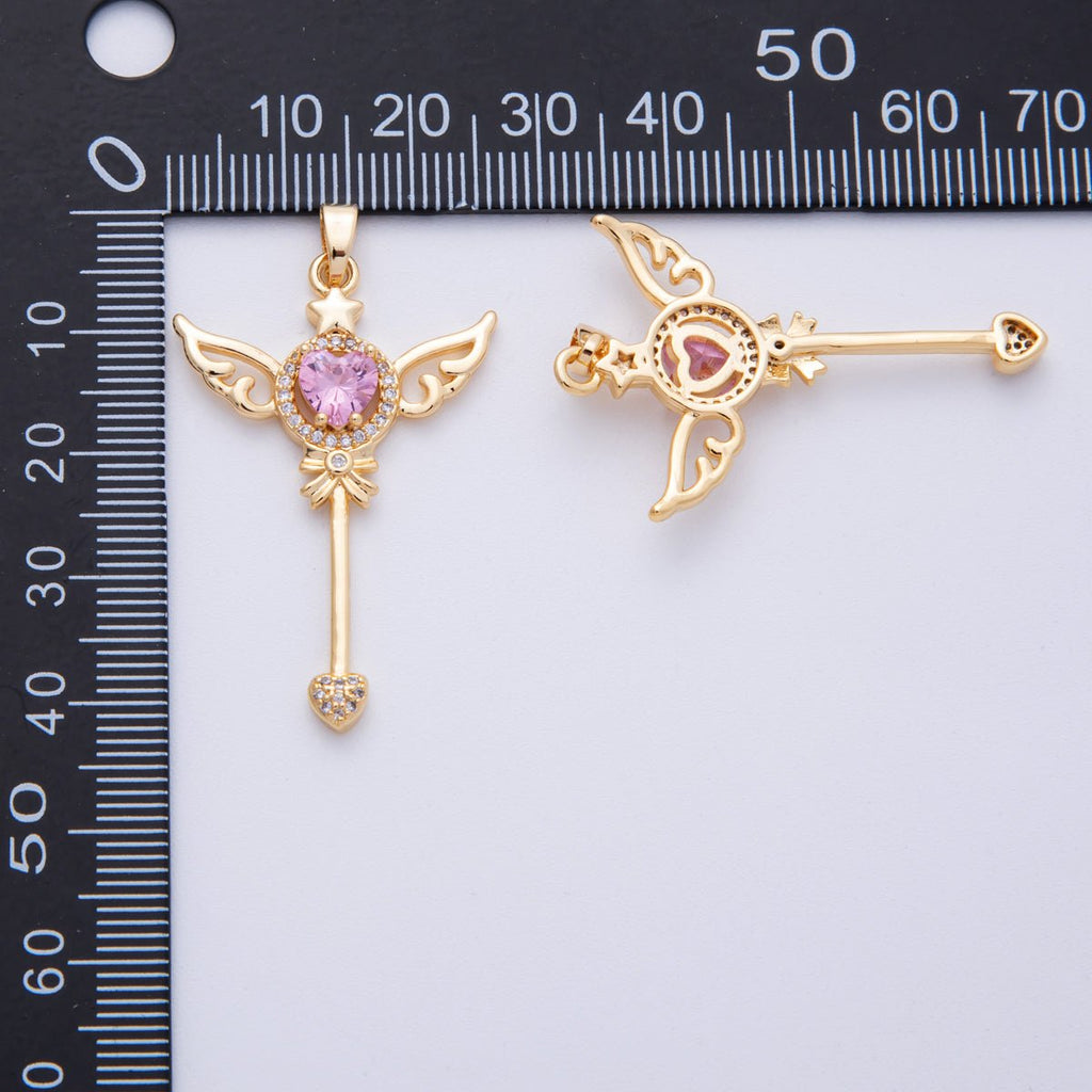 18K Gold Filled 40mm Pink Heart Micro Paved CZ Fairy Magic Wand Pendant | CHARMS-00105