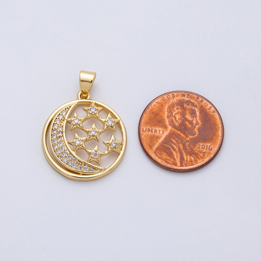 16K Gold Filled 21mm Micro Paved CZ Open Celestial Crescent Moon Star Round Pendant | Charms-00183