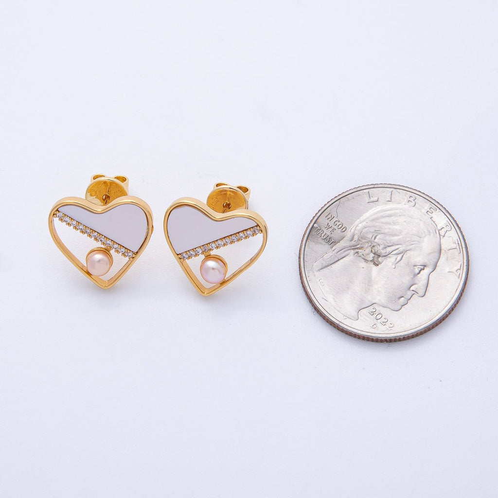 18K Gold Filled 14.8mm Shell Pearl Micro Paved CZ Heart Stud Earrings | AB1683