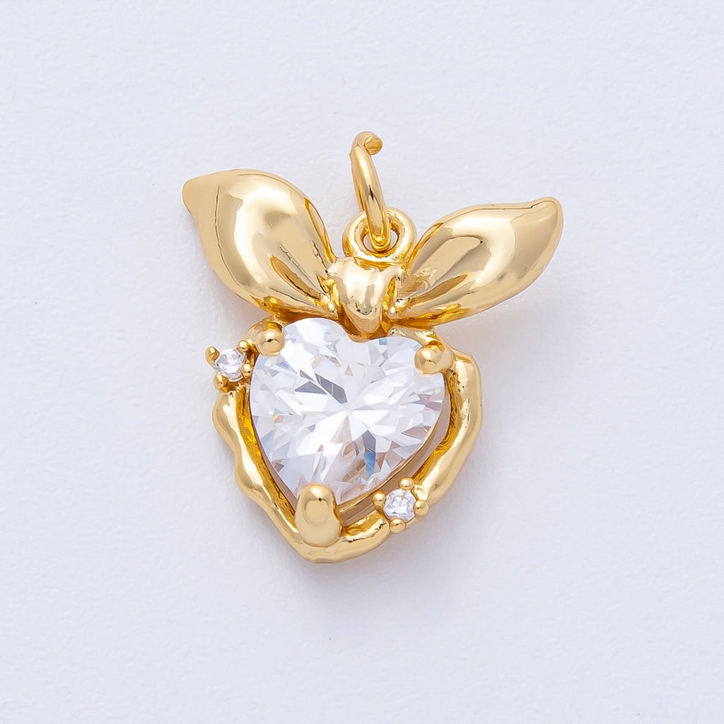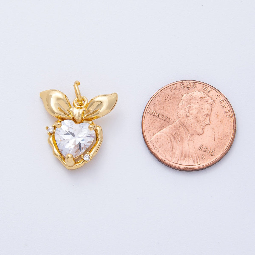 18K Gold Filled 16mm Clear CZ Ribbon Bow Heart Charm | AK195