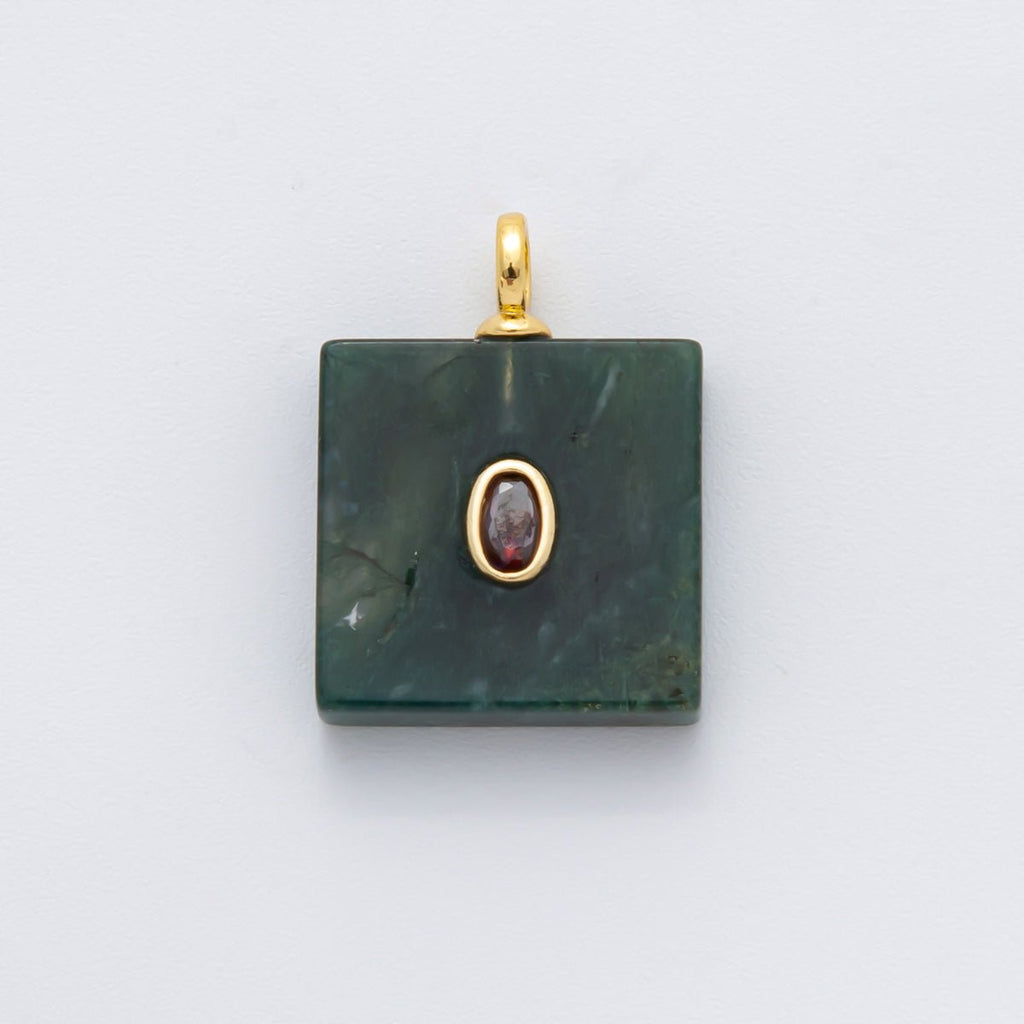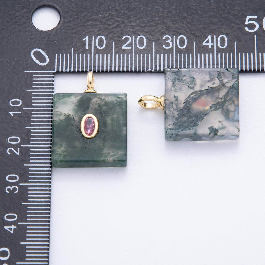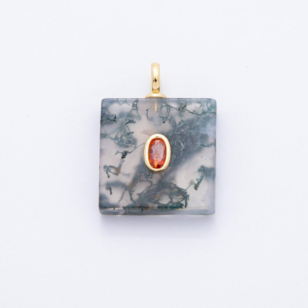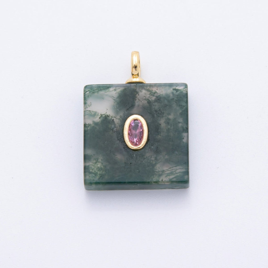 18K Gold Filled Clear, Red, Pink CZ Moss Agate Gemstone Square Pendant | N880 N917