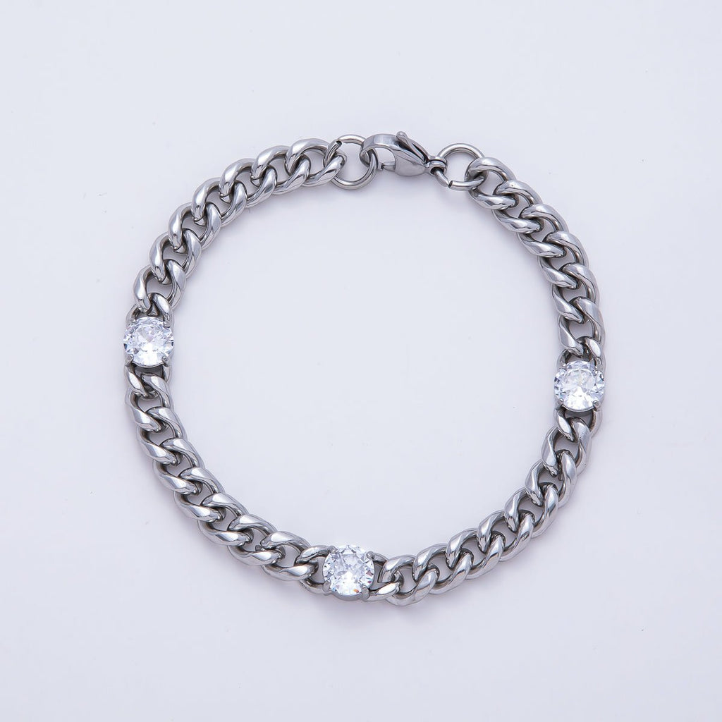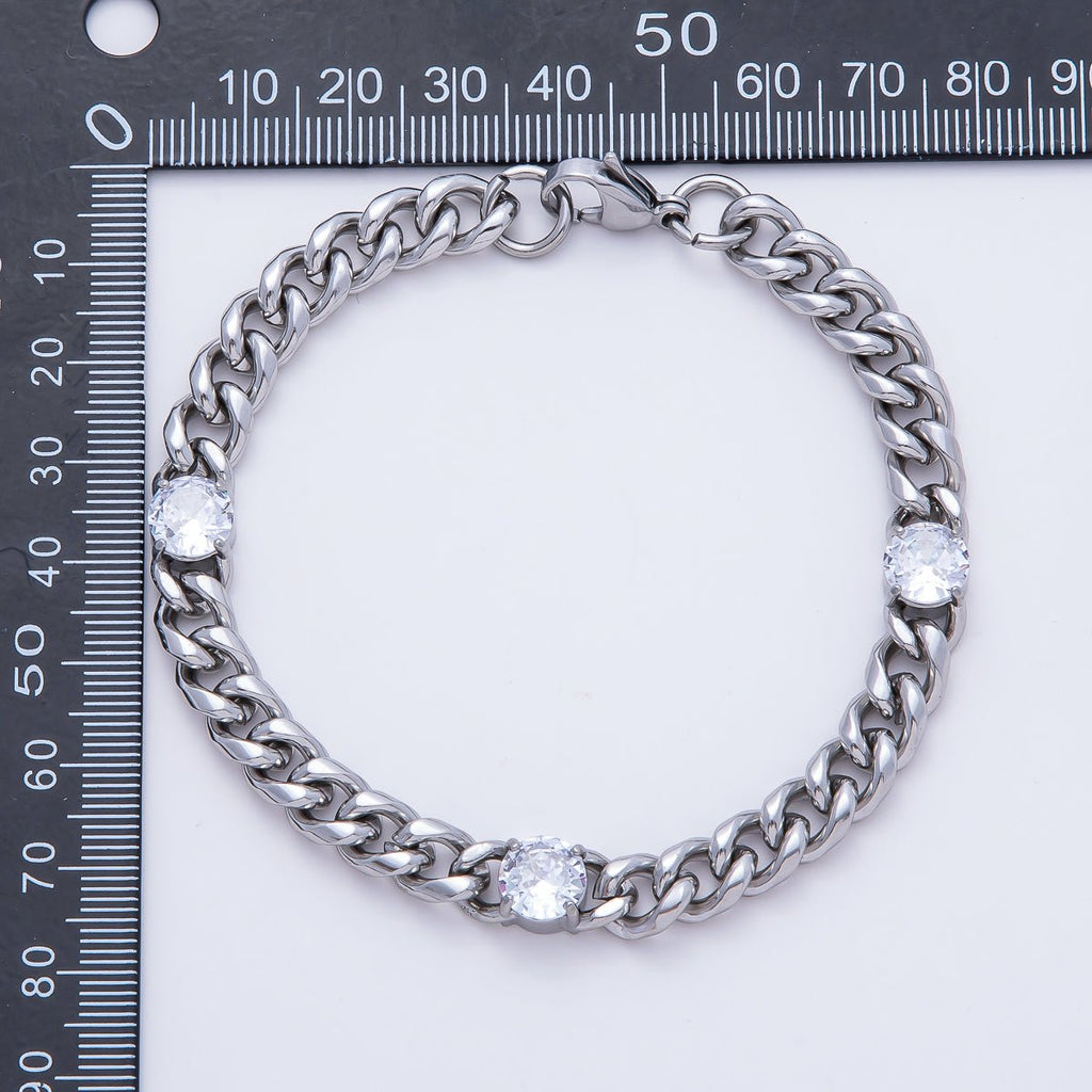 Silver Stainless Steel 8mm Triple CZ Curb Chain 8.66 Inch Bracelet | WA-04161