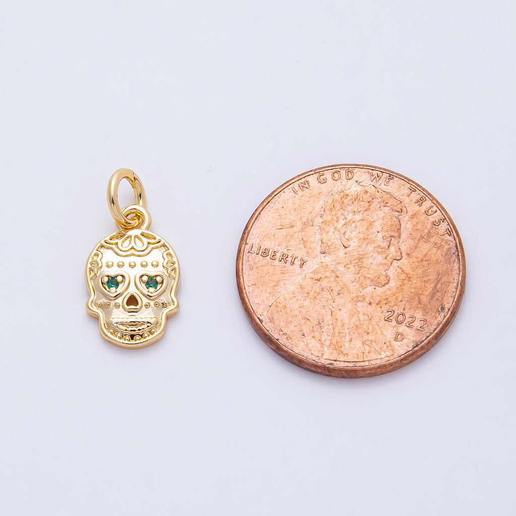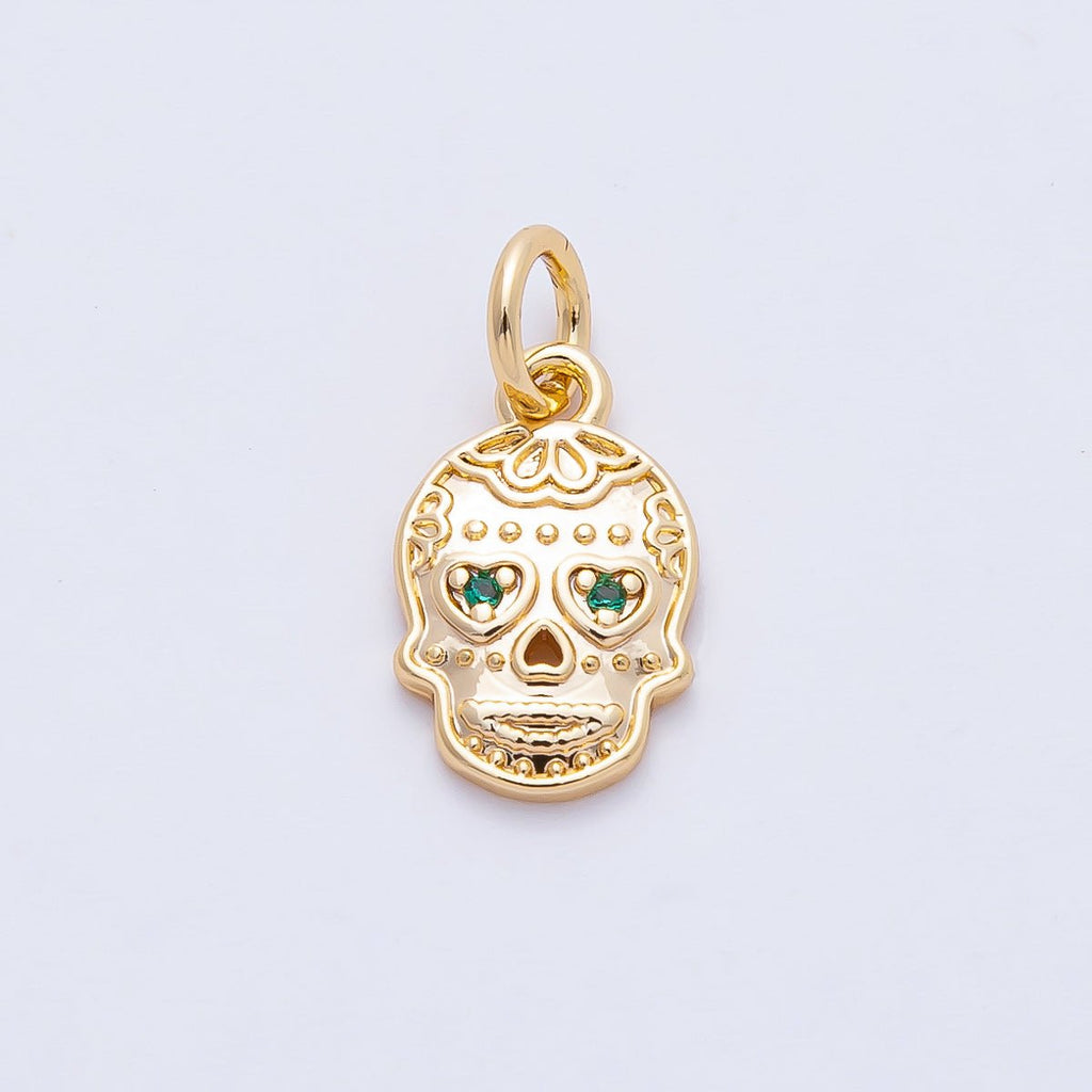 18K Gold Filled 13mm Green CZ Dios Muertos Human Skull Skeleton Head Charm | AF1463