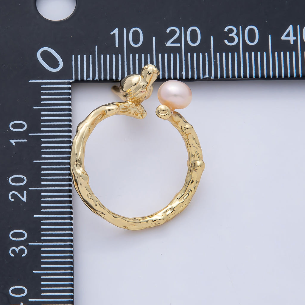 18K Gold Filled Bird on a Branch with Champagne and White Shell Pearl Nature Inspired Animal Adjustable Ring | O798