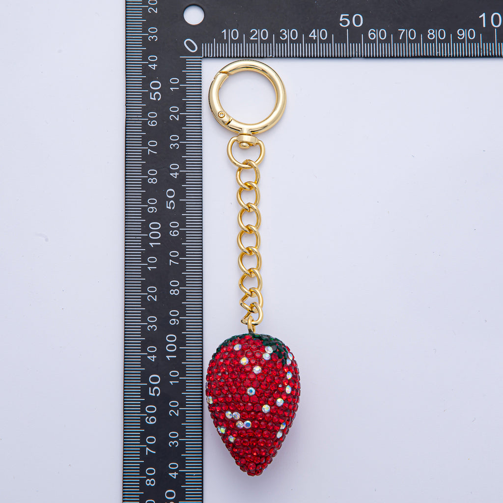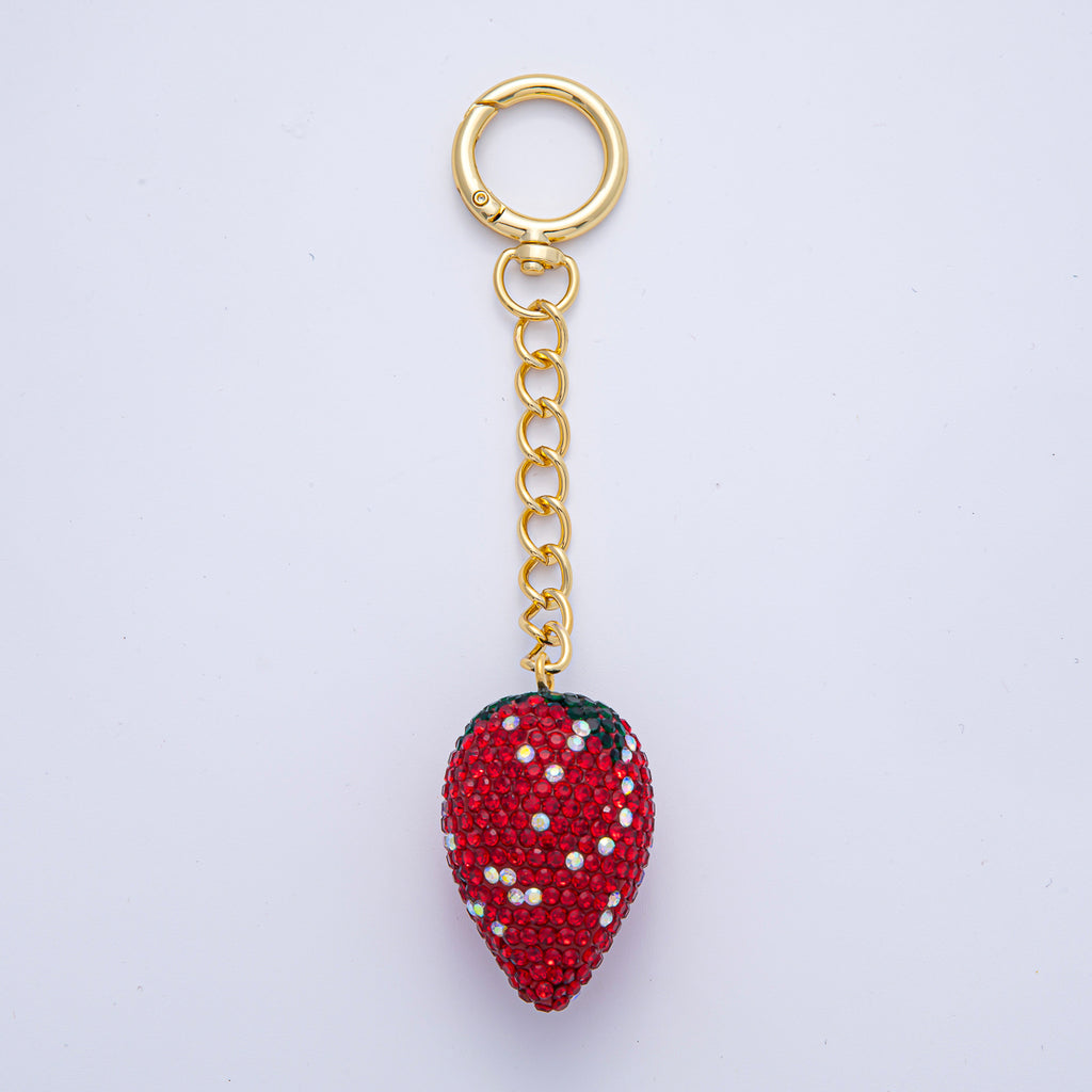 18K Gold Filled Red Strawberry Bedazzled Bag Charm Keychain Push Gate Key Ring | WB-00254