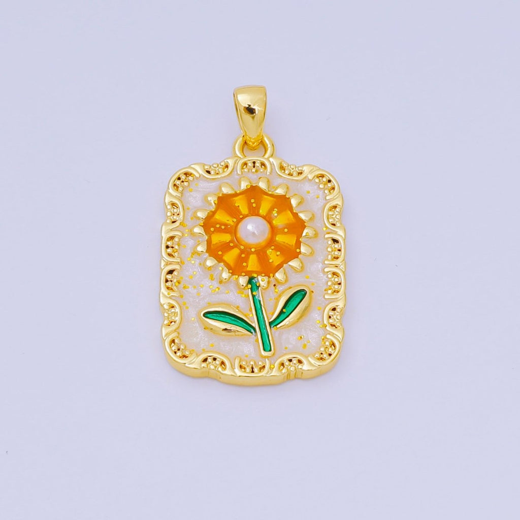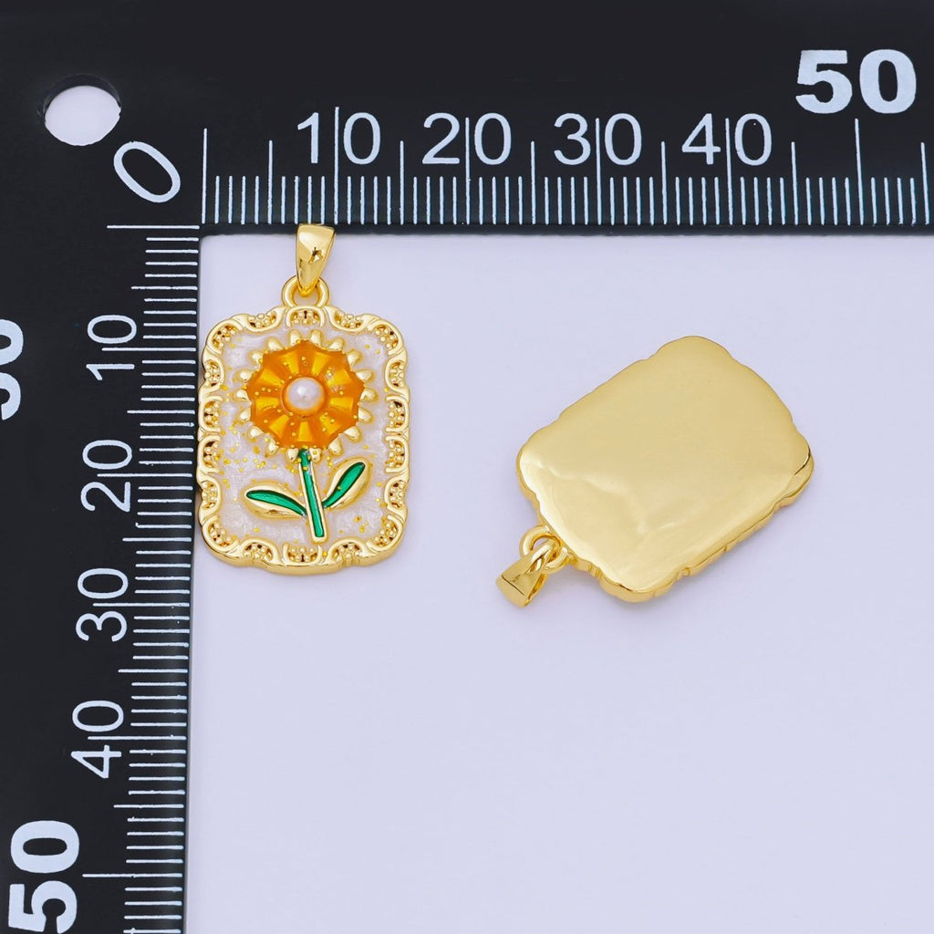24K Gold Filled 24mm Enamel Art Sunflower Medallion Rectangle Pendant | AA-1603