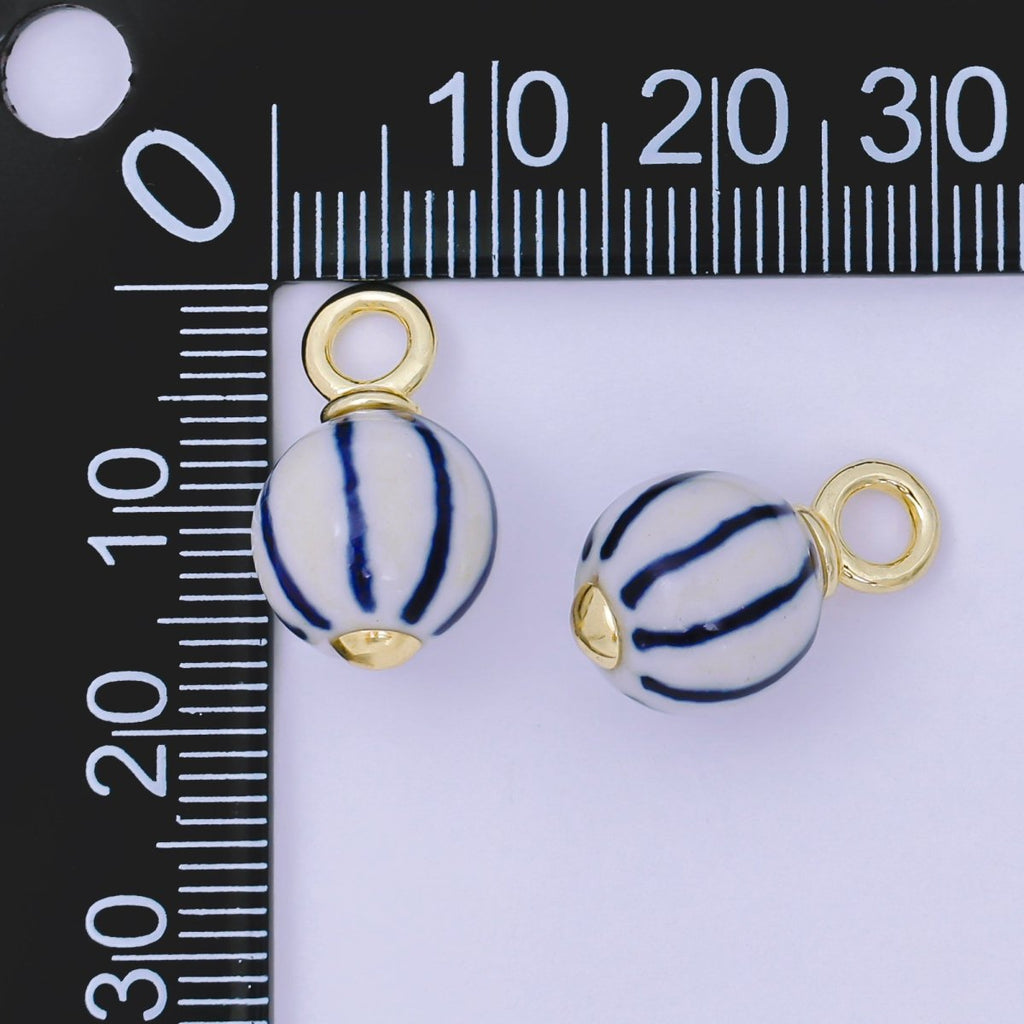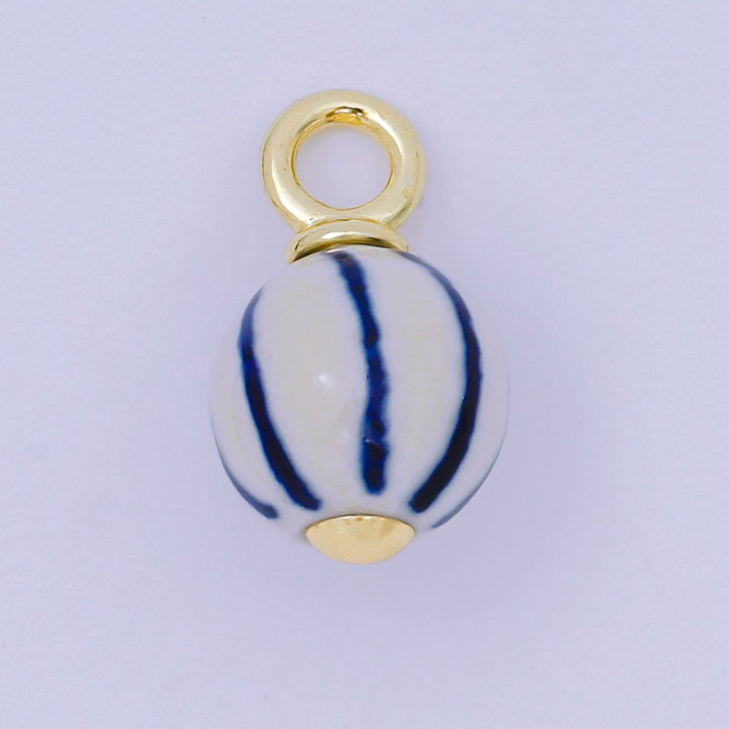 24K Gold Filled Blue-White Stripes Porcelain Ceramic Oblong Drop Charm | AF1279