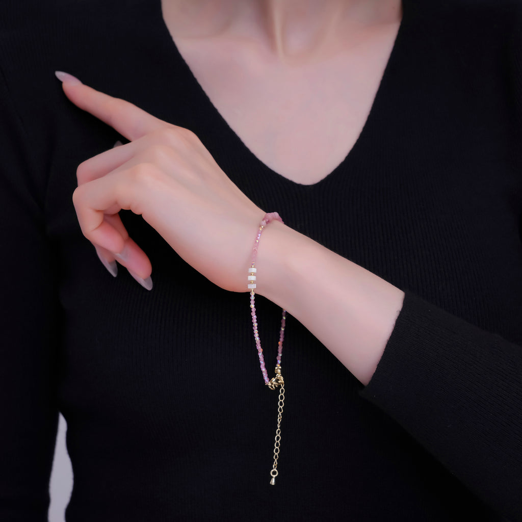 24K Gold Filled 2mm Shell Pearl Pink Quartz Multifaceted Gemstone 9 Inch Anklet | WA-2945