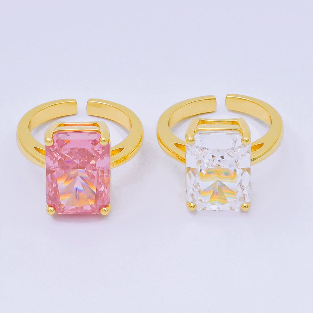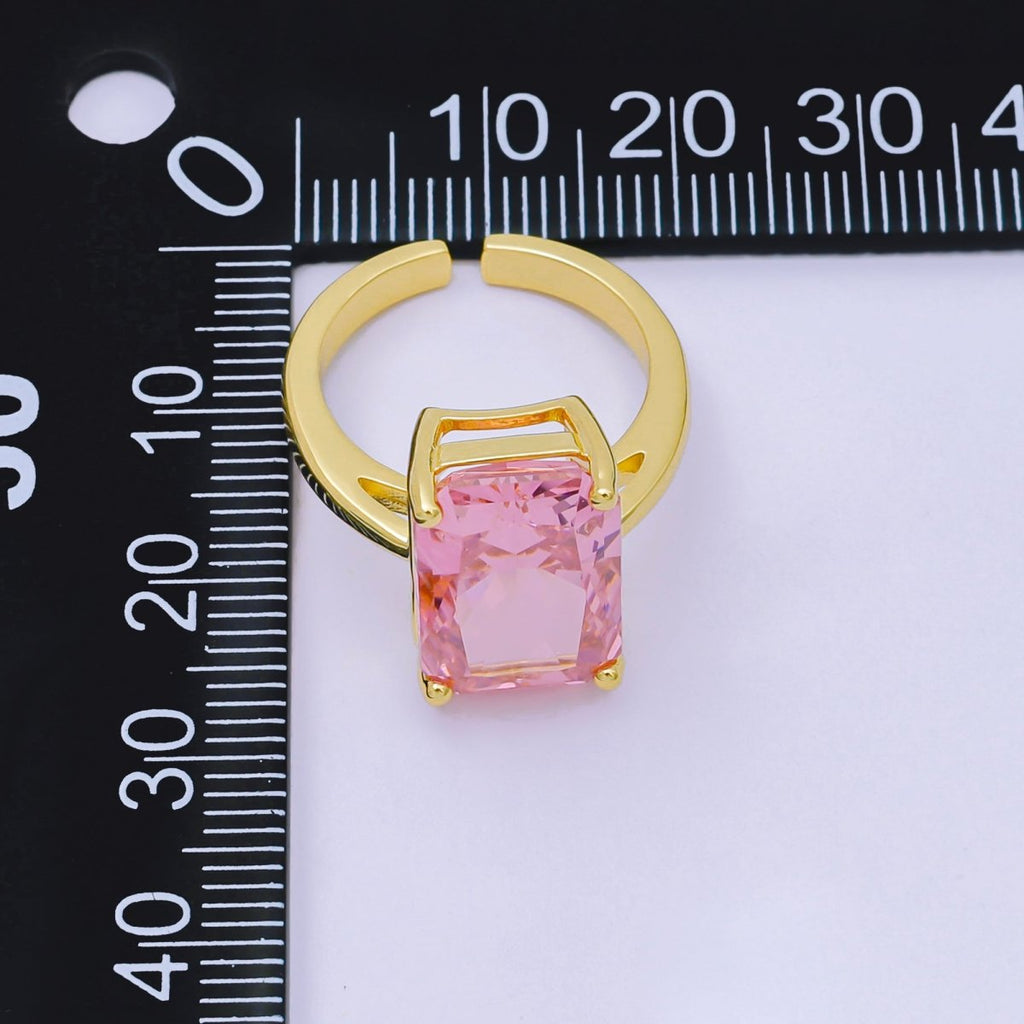 24K Gold Filled Pink & Clear Rectangular CZ Statement Solitaire Adjustable Ring | O-1035 O-1059