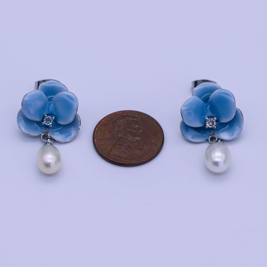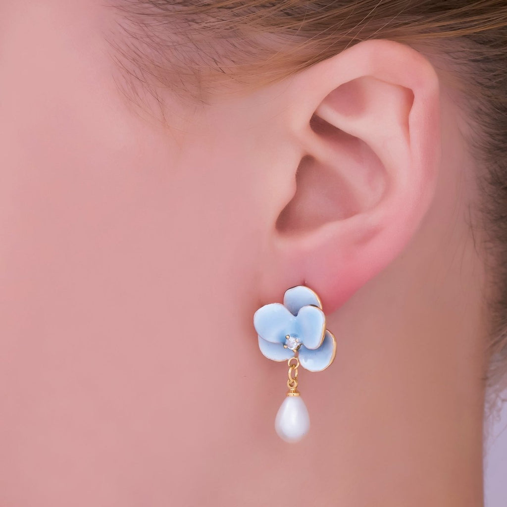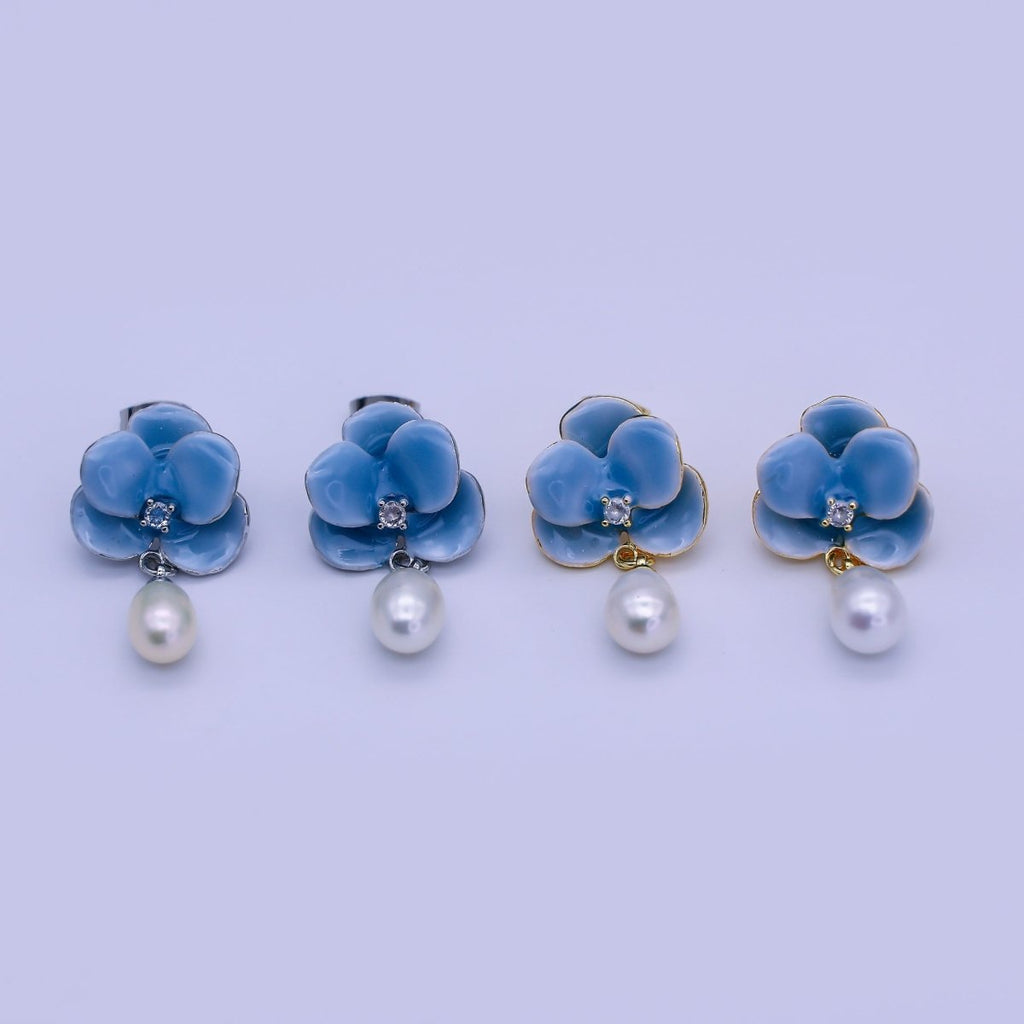 24K Gold Filled Round CZ Enamel Art Sky Blue Orchid Flower Shell Pearl Drop Stud Earrings in Gold & Silver | AJ-106 AJ-107