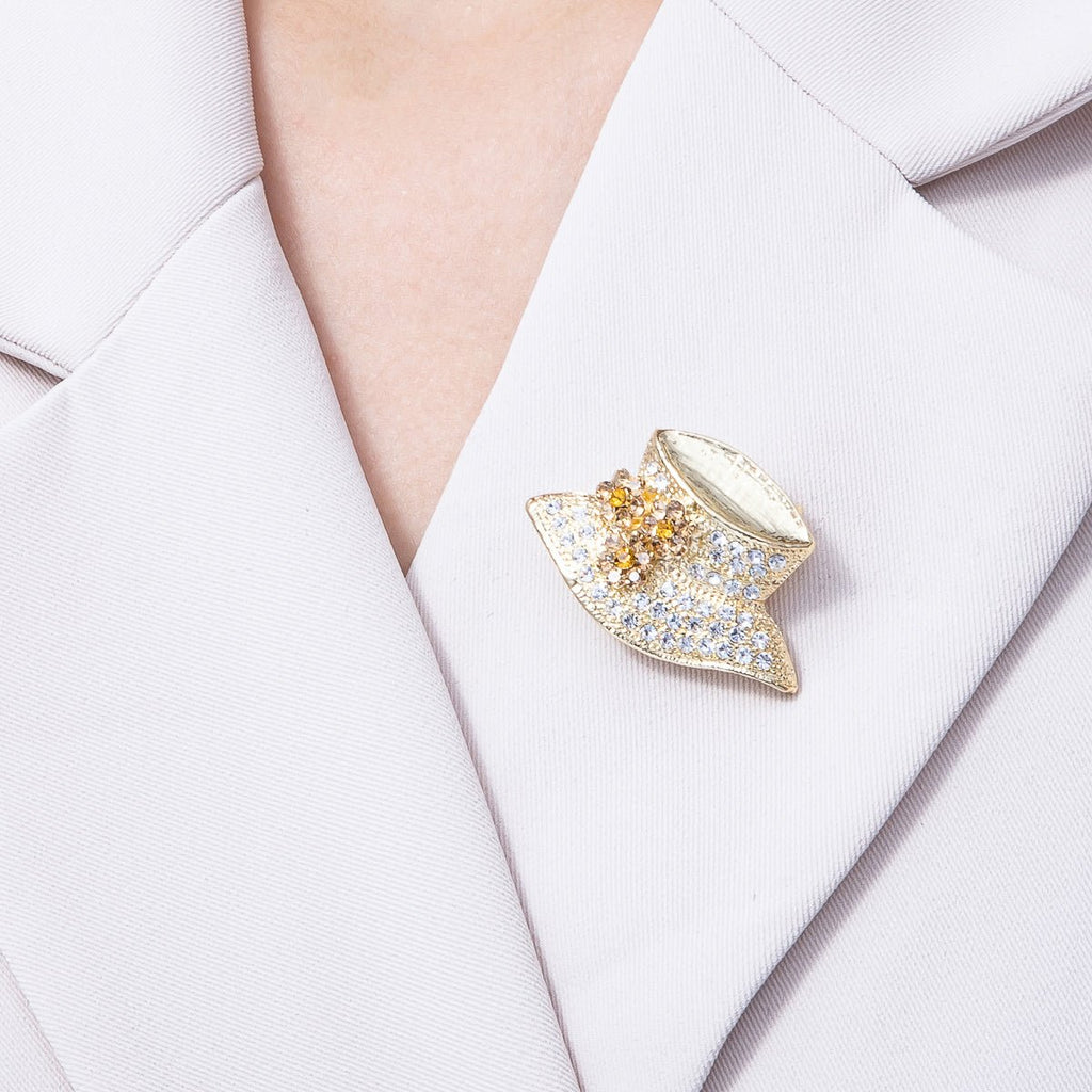 Gold 40mm x 26.5mm Rhinestone Flower Hat Pin Brooch | BH-073