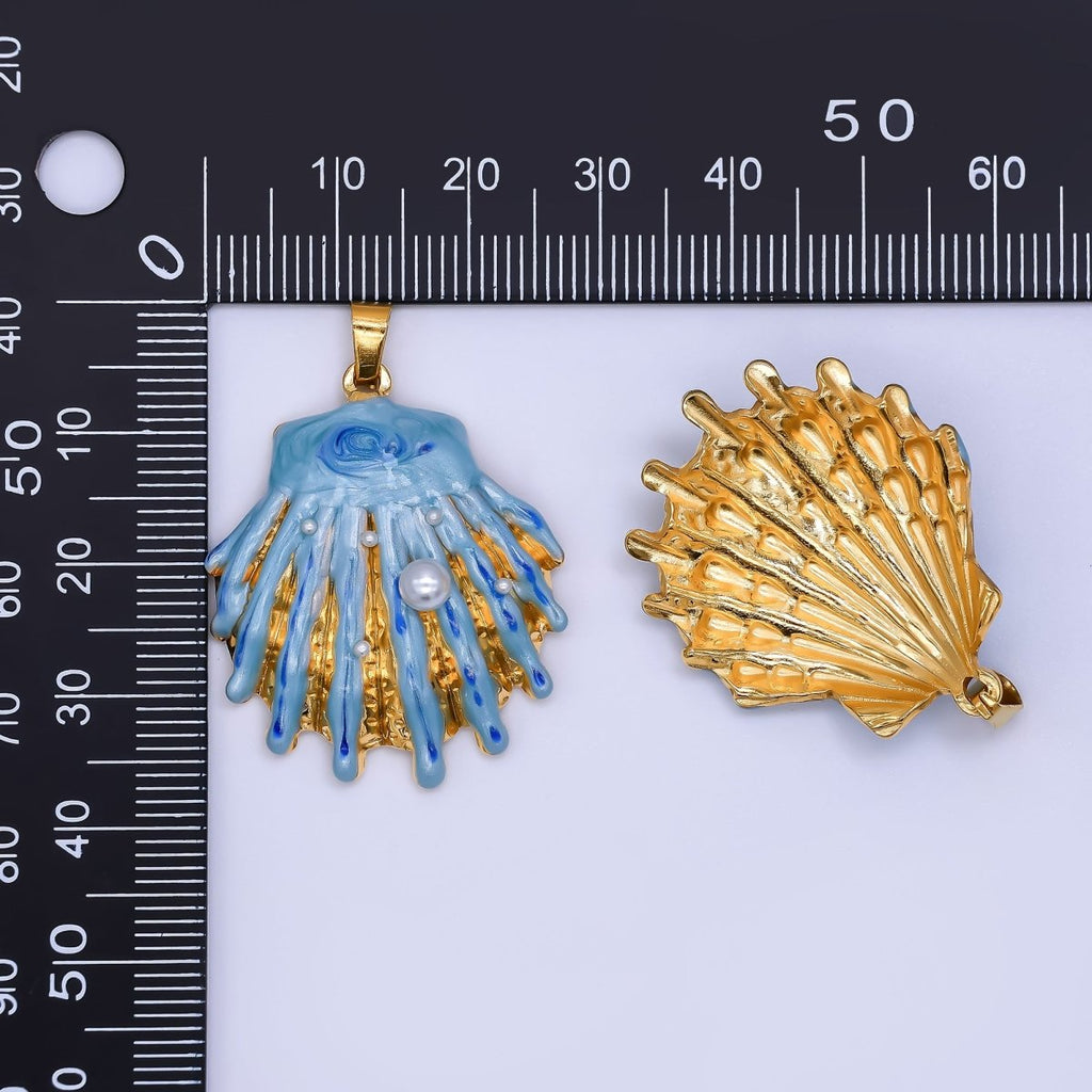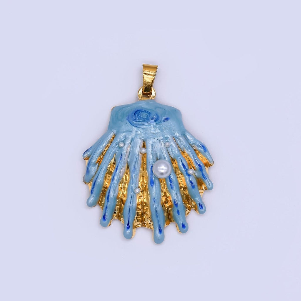 Gold Stainless Steel 33mm Hand-Painted Enamel Blue Clam Shell Pendant | J169