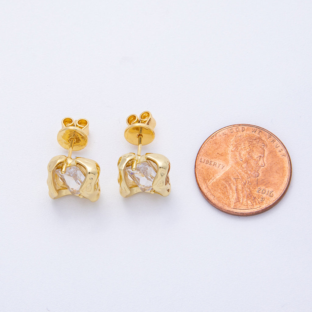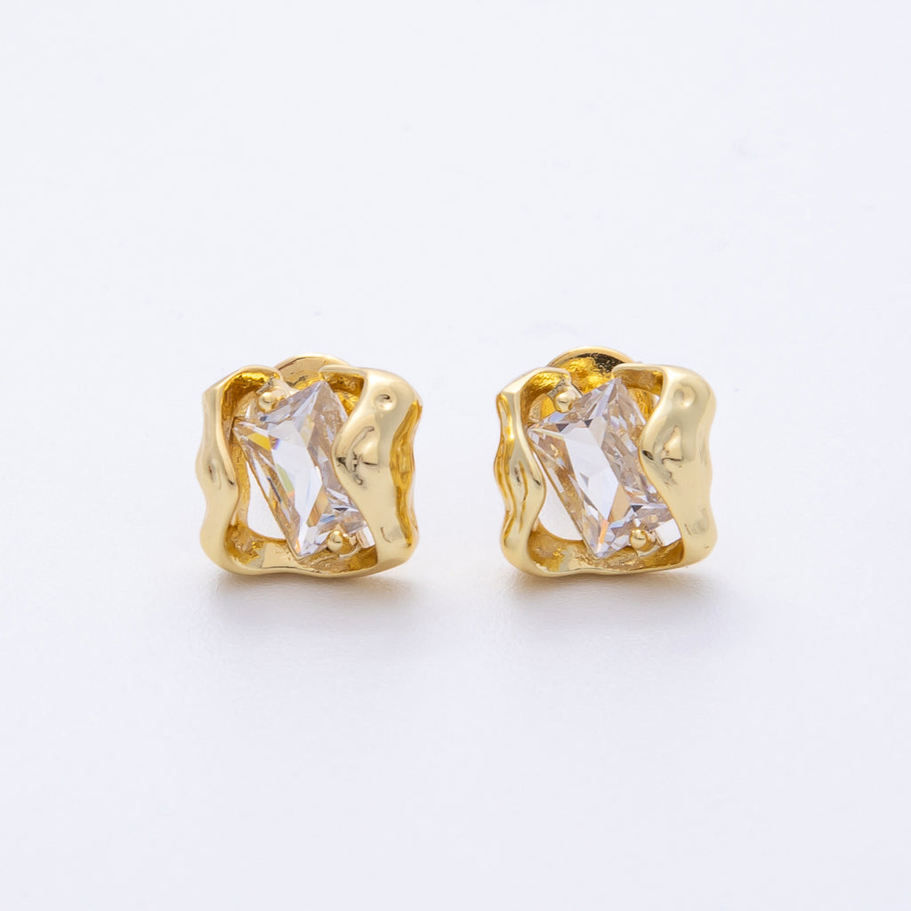18K Gold Filled 9.5mm Clear CZ Baguette Molten Stud Earrings | T121